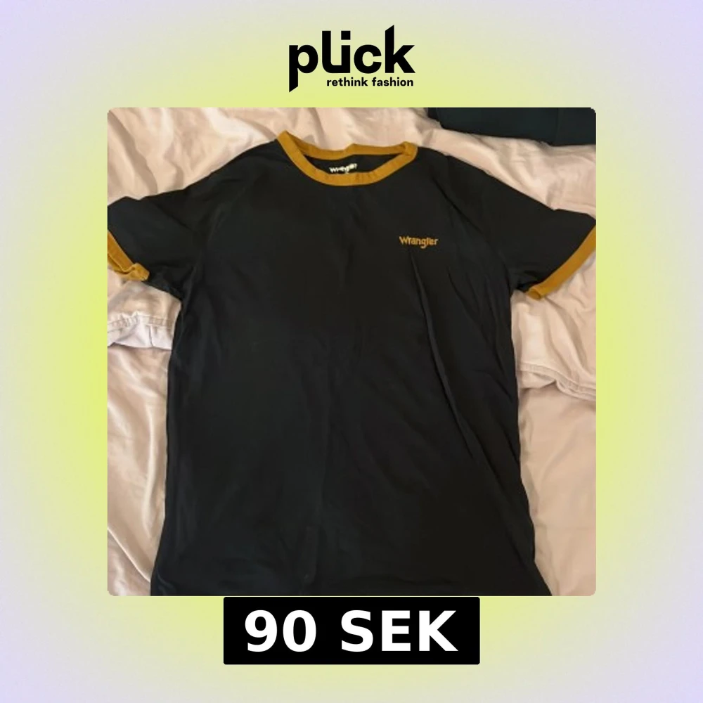 Svart t-shirt från Wrangler med senapsgula kanter vid halsringning och ärmslut. T-shirten har en klassisk passform och korta ärmar. Wrangler-loggan är tryckt i senapsgult på bröstet. Tillverkad i 100% ekologisk bomull för skön känsla.