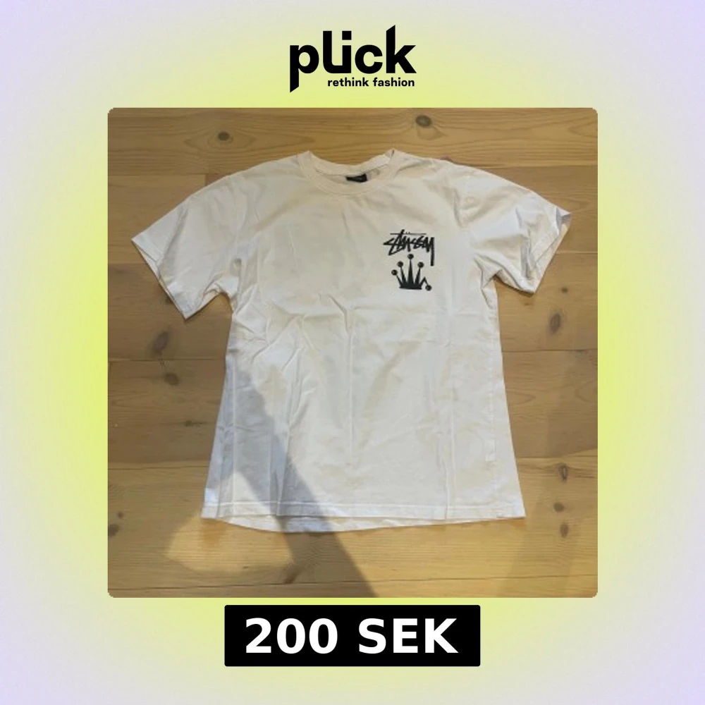 Vit t-shirt från Stüssy med svart grafisk logga och kronmotiv både fram och bak. Stor passform med rund hals och korta ärmar. Tillverkad i mjuk bomull, perfekt för en streetwear-look.