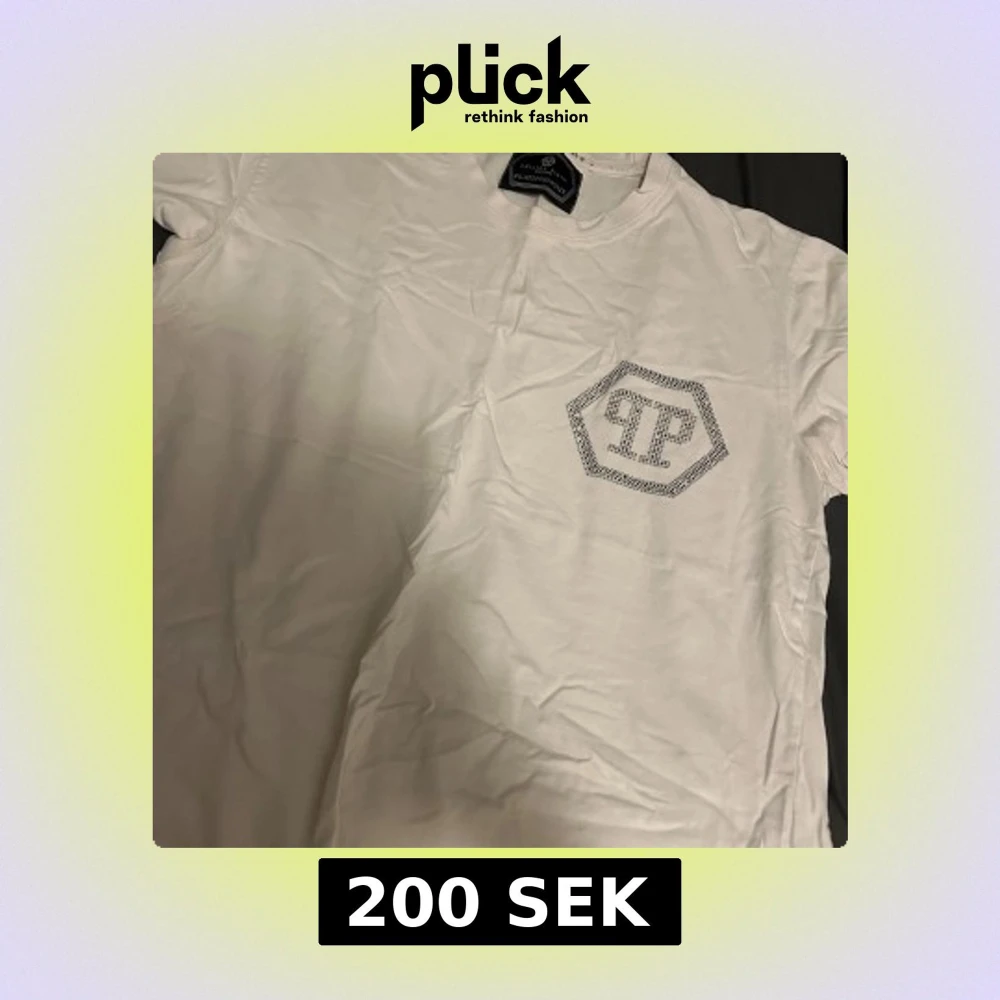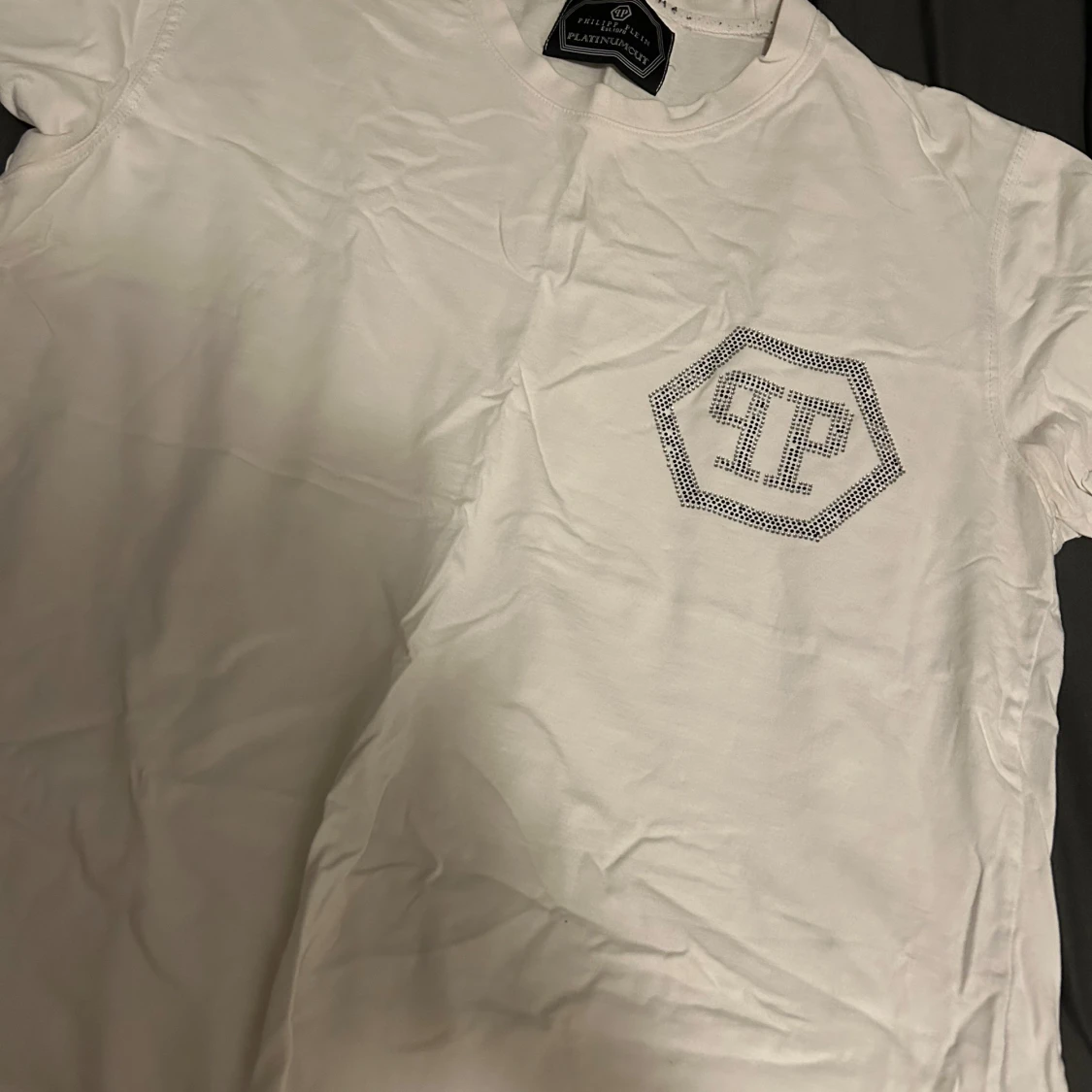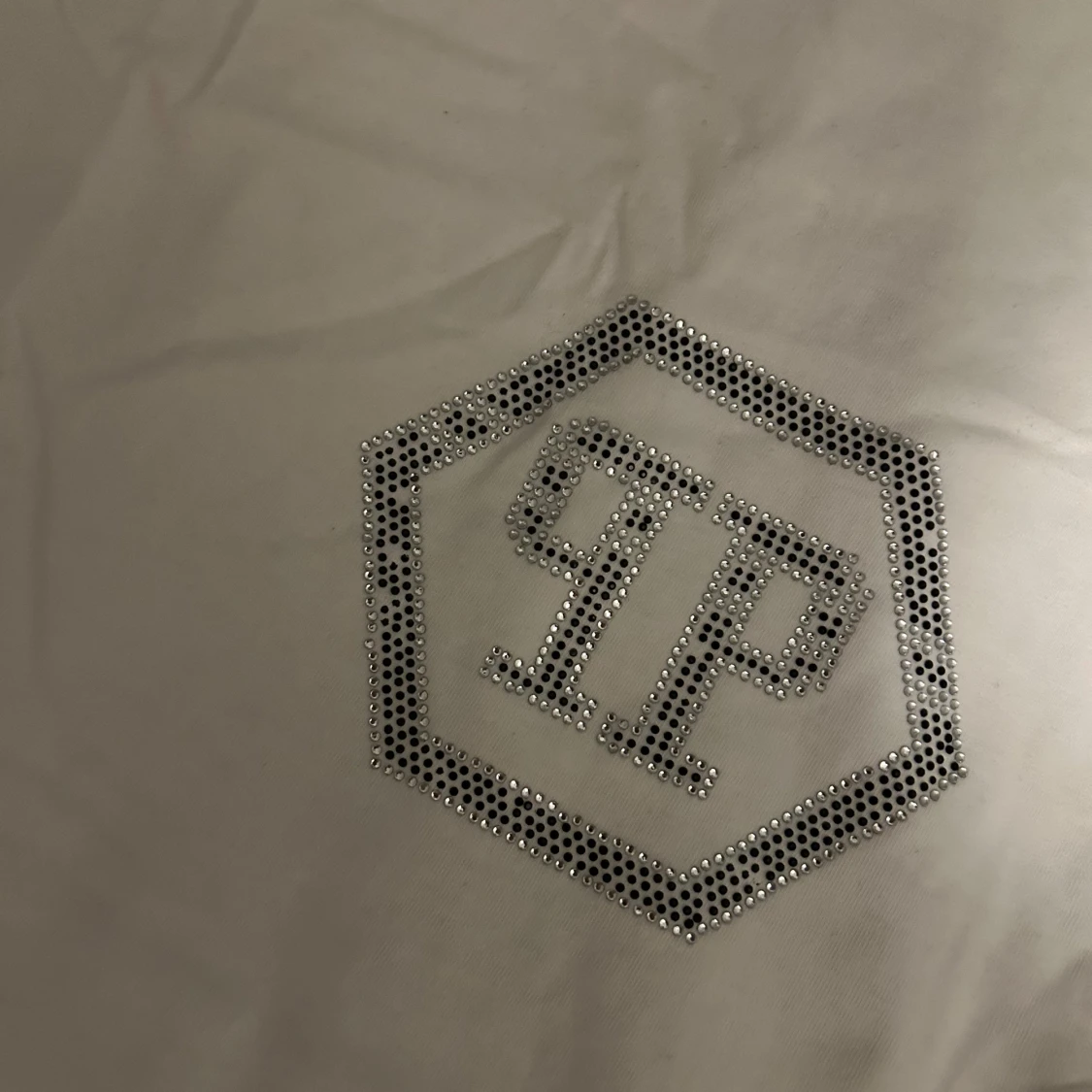 Vit t-shirt från Philipp Plein med korta ärmar och rund hals. På bröstet sitter ett stort PP-logo i silverfärgade strass-stenar som ger en lyxig vibe. Tillverkad i mjuk bomull för skön känsla och snygg passform.