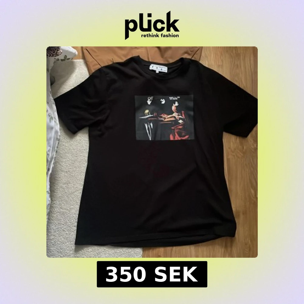 Säljer en svart t-shirt från Off-White med ett konstnärligt tryck på bröstet. T-shirten har rund hals och korta ärmar. Perfekt för dig som gillar streetwear och vill sticka ut med en unik design.