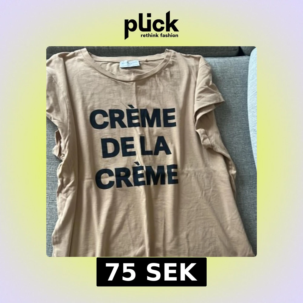 Beige t-shirt från Holly & Whyte med svart text 'CRÈME DE LA CRÈME' på framsidan. Klassisk rund halsringning och korta ärmar. Tillverkad i mjuk bomull, perfekt för en chill och trendig look.