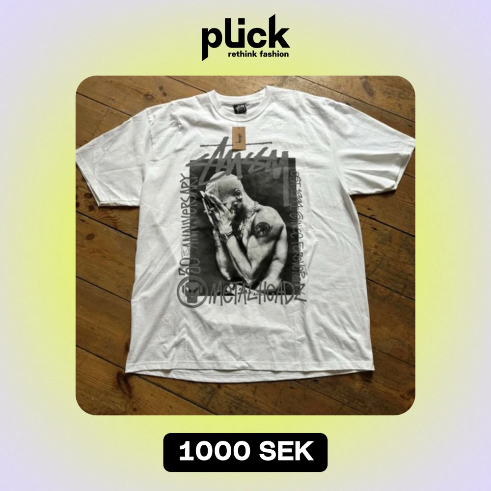Säljer en vit t-shirt från Stüssy med ett stort tryck på framsidan som firar Metalheadz 30-årsjubileum. T-shirten har ett coolt svartvitt motiv och textdetaljer. Perfekt för dig som gillar streetwear och musik. Den är i nytt skick och har en normal passform.