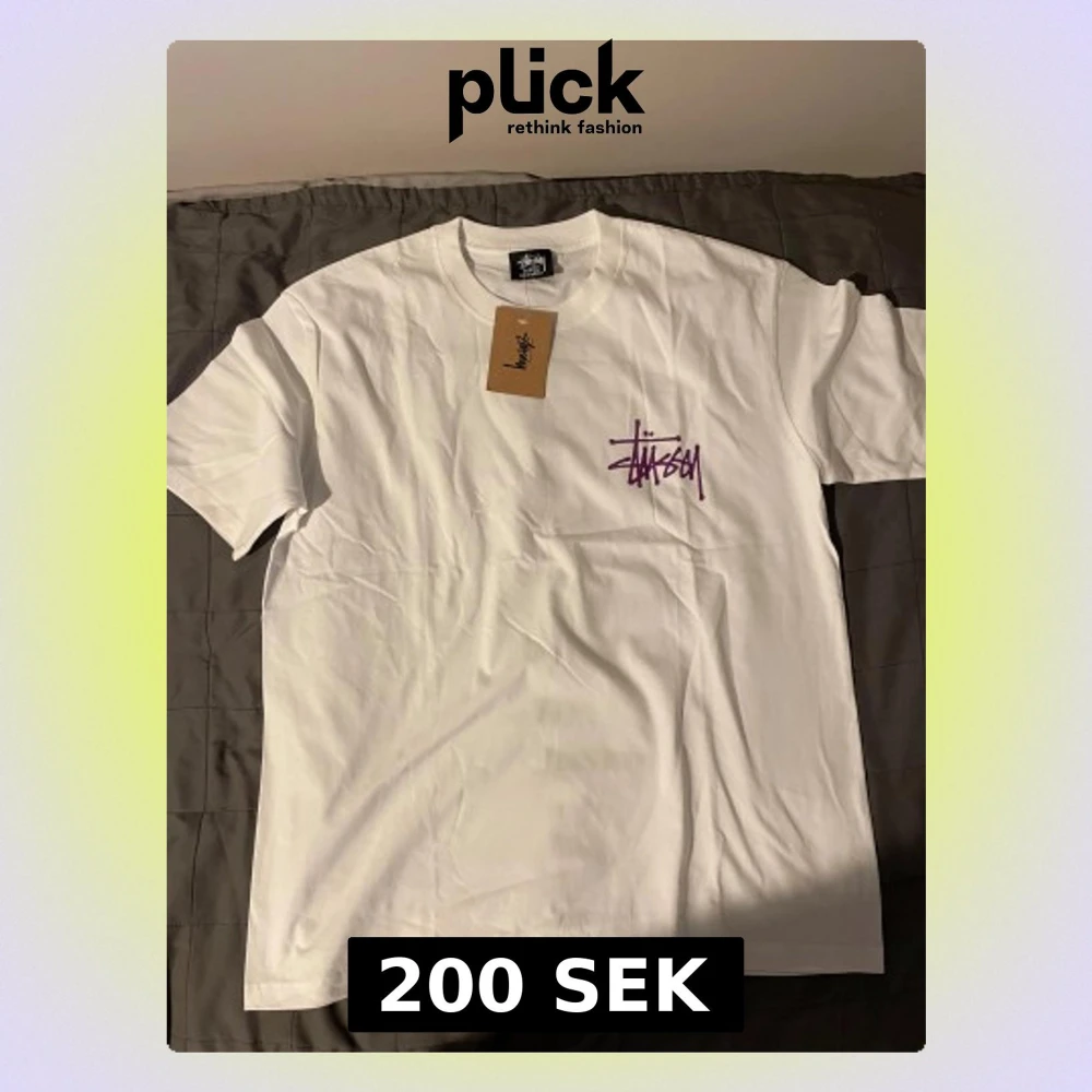 Vit t-shirt från Stüssy i storlek XL med ikonisk lila Stüssy-logga tryckt på bröstet och stort på ryggen. Klassisk passform och rund hals. Tillverkad i mjuk bomull, perfekt för en clean streetwear-look.