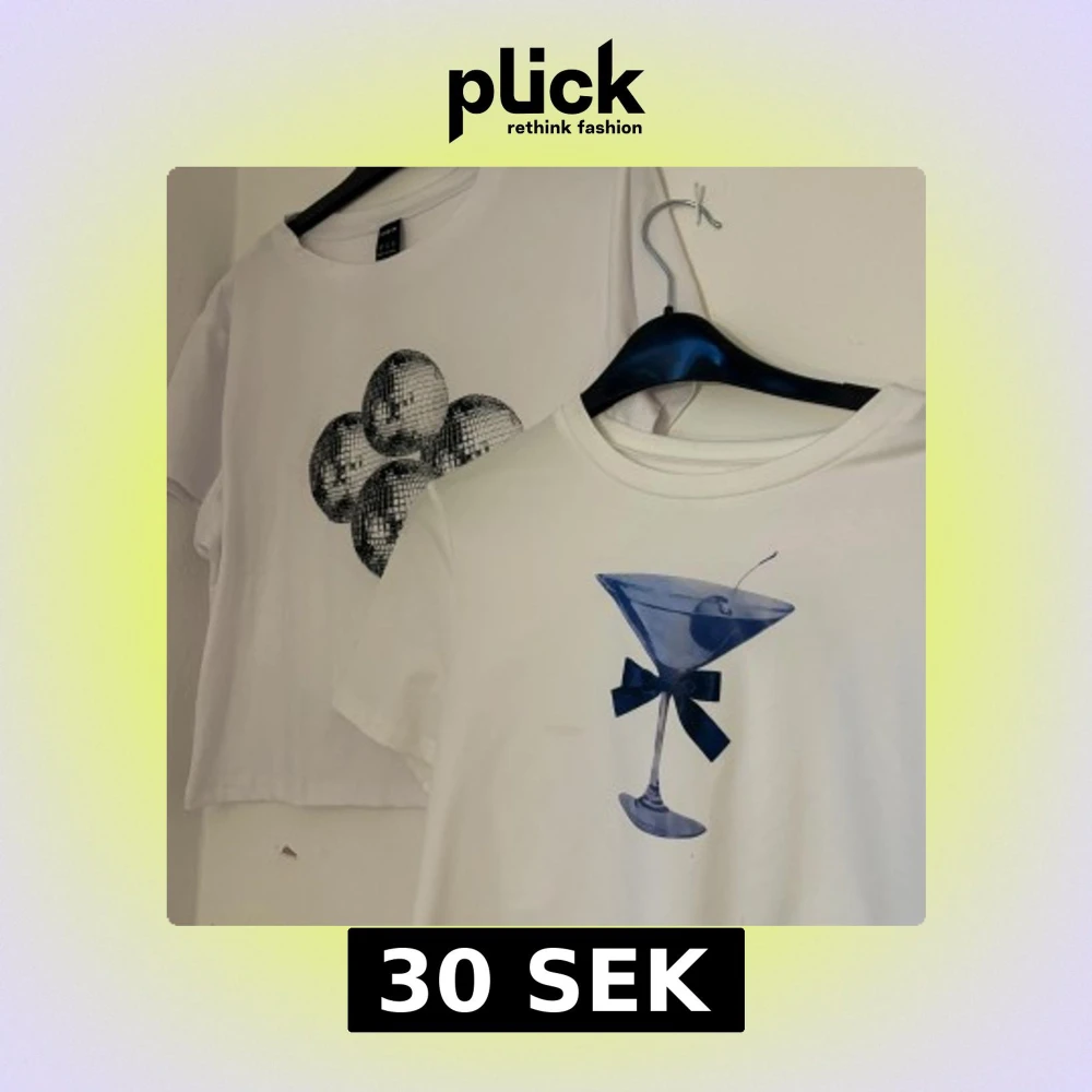 Säljer två vita t-shirts med tryck. Den ena har ett stort martiniglas med en blå rosett, och den andra har ett tryck av en discokula i form av en blomma. Perfekta för en avslappnad stil med en twist. 30kr för båda två. Storlek XL men är så pass små att de passar xs/s