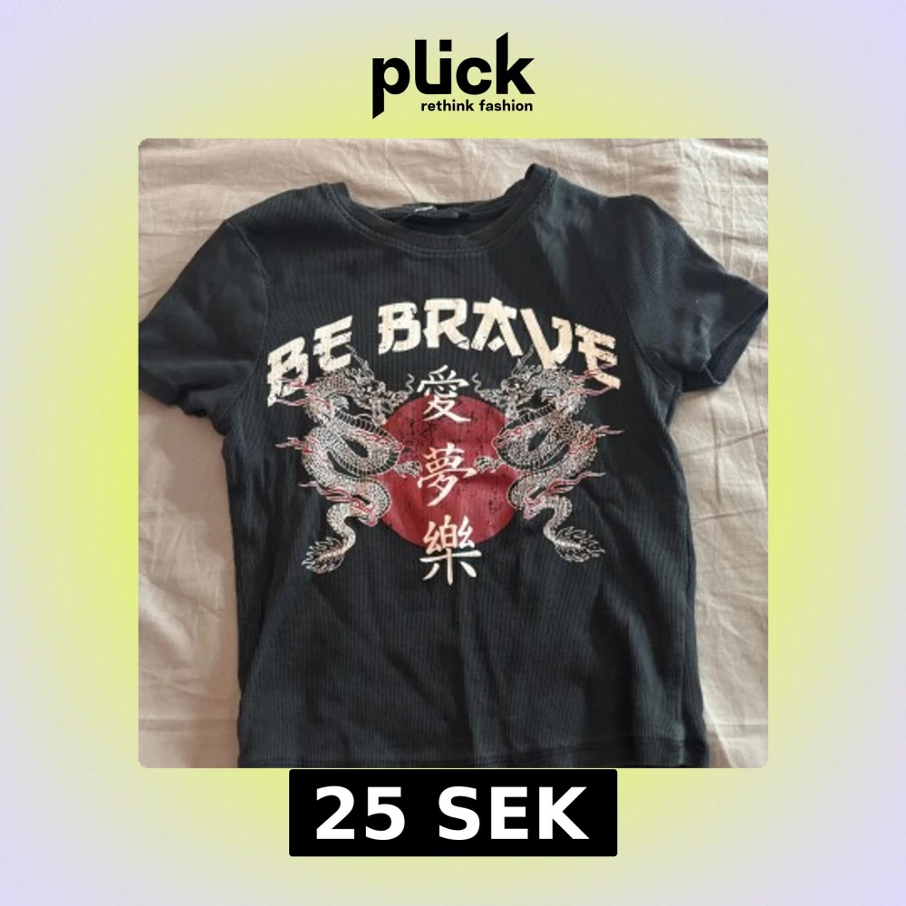Cool svart ribbad t-shirt från New Yorker i storlek XS. Framsidan har ett stort tryck med två drakar, röd cirkel och texten 'BE BRAVE' samt asiatiska tecken. T-shirten är kortärmad och har en tight passform. Använd fåtal gånger så den är som ny.