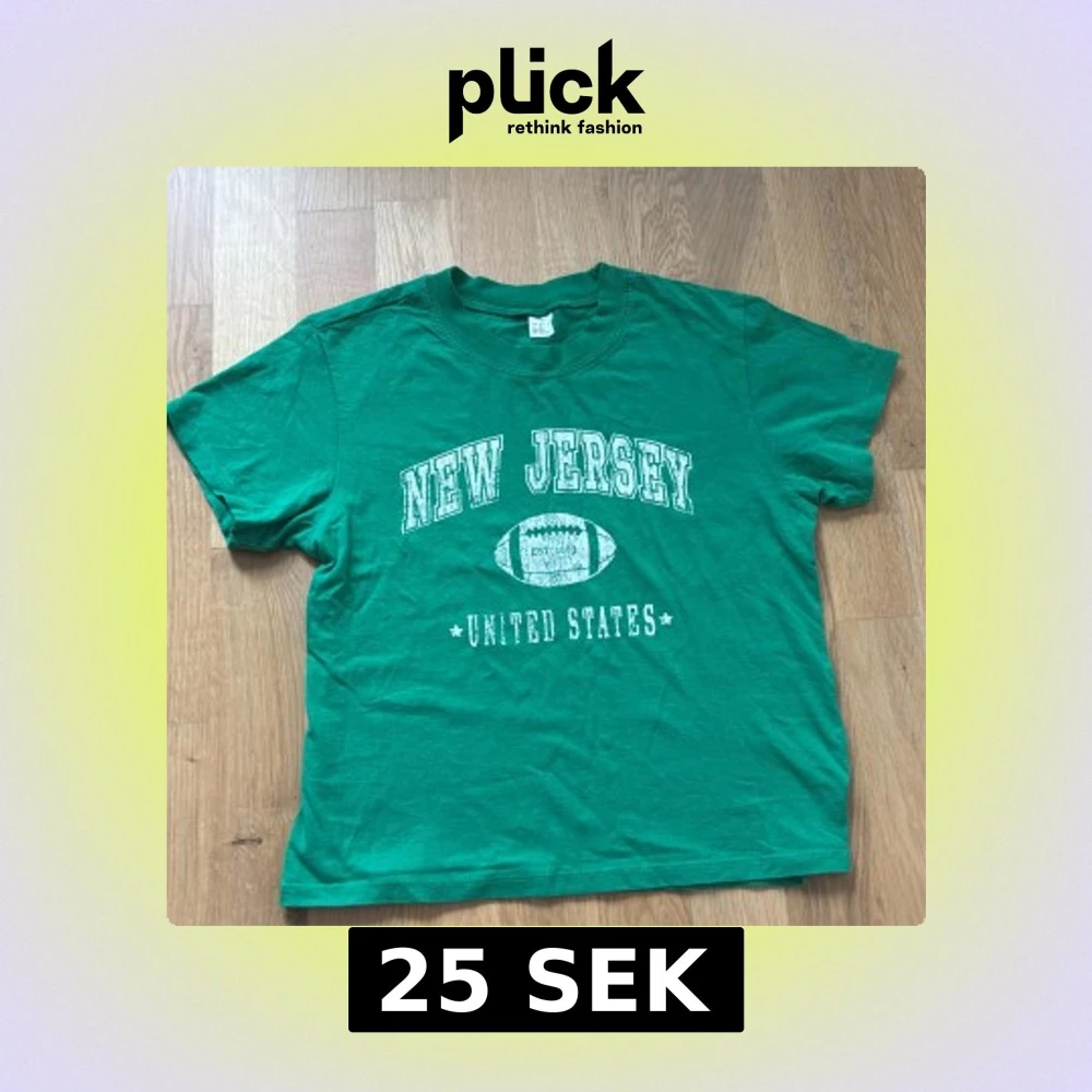 Snygg grön t-shirt med vit text 'New Jersey United States' och en amerikansk fotboll på bröstet. Klassisk passform med rund hals och korta ärmar. Perfekt för dig som gillar sportig och avslappnad stil. Köptes från H&M.