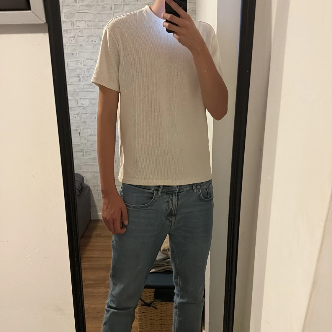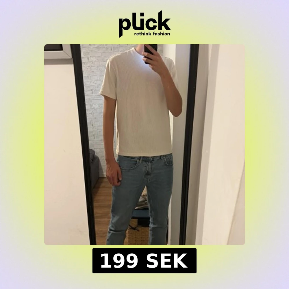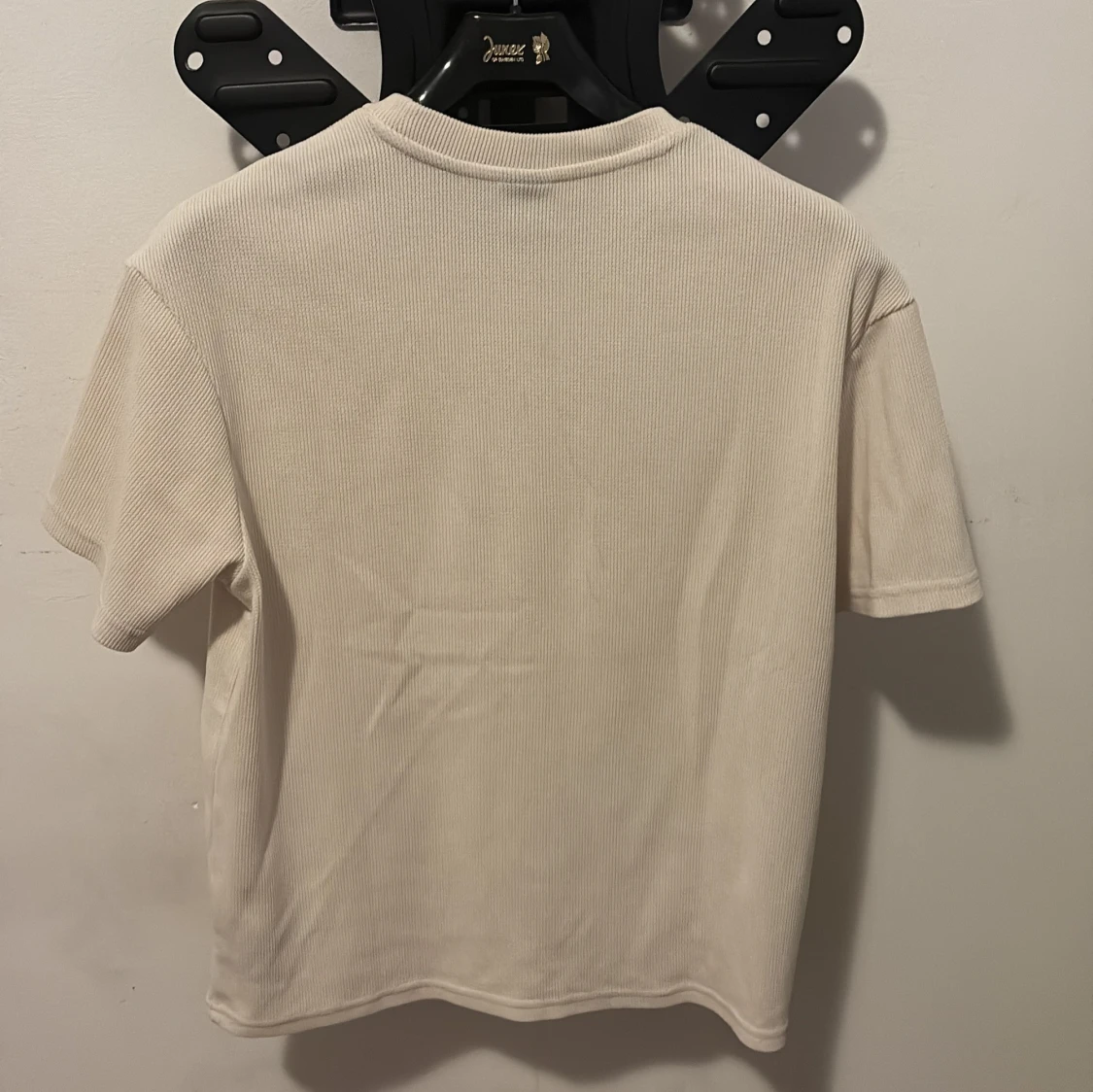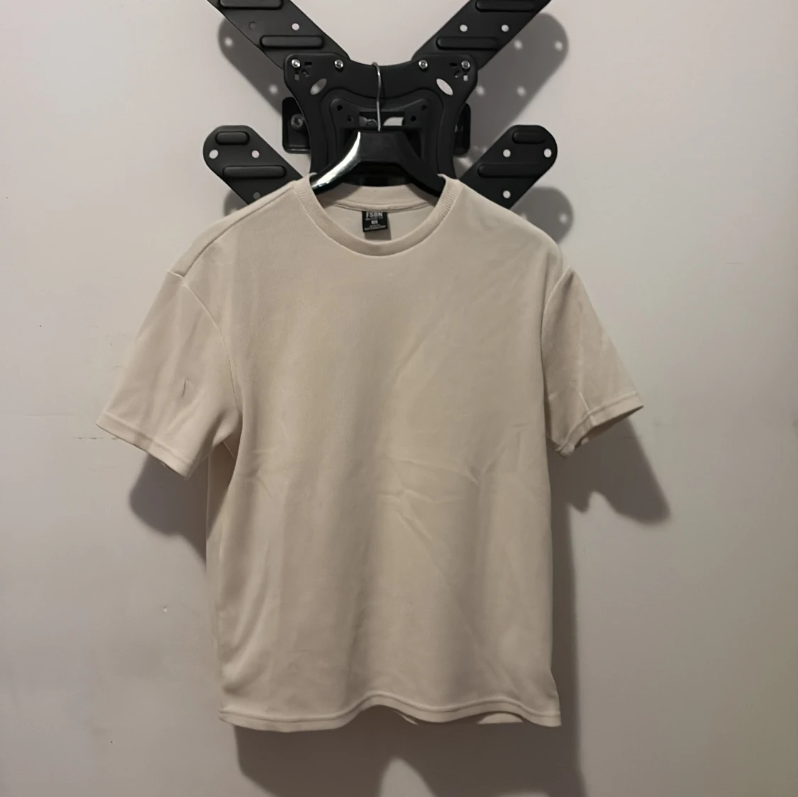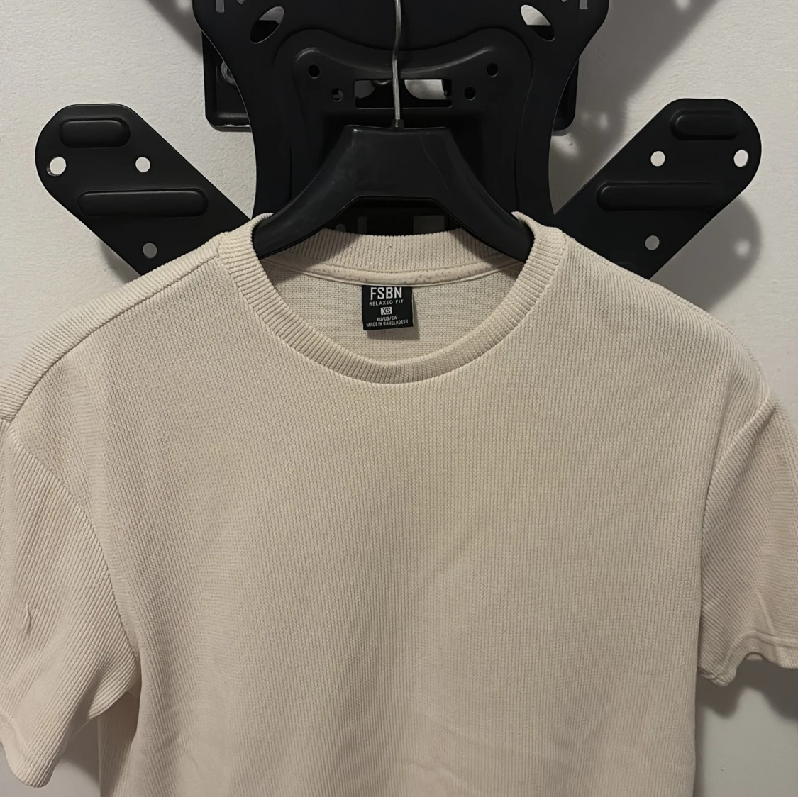 Säljer en stilren beige t-shirt från FSBN i storlek M. T-shirten har ribbad struktur, rund hals och korta ärmar. Perfekt för dig som gillar enkel och clean look. Materialet är mjukt och skönt, troligtvis bomull. Passformen är normal.