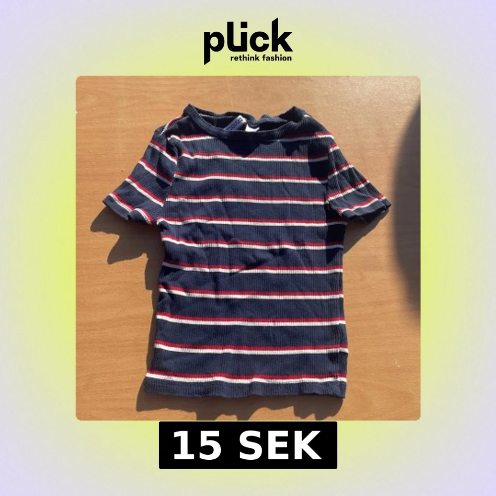 Mörkblå ribbad t-shirt från H&M Divided i storlek XS. T-shirten har korta ärmar och är täckt av horisontella ränder i vitt och rött. Materialet är mjuk bomull och passformen är normal. Perfekt för en chill och stilren look.