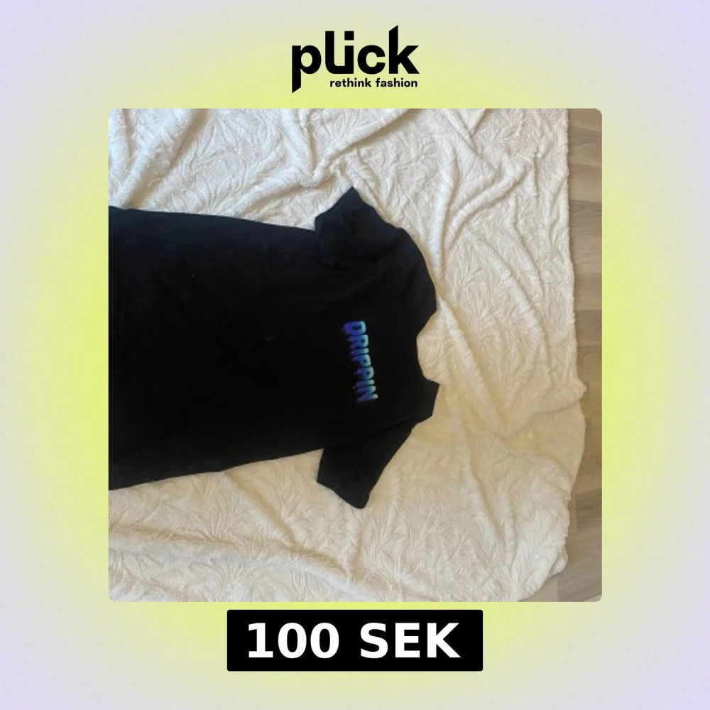 Säljer en svart t-shirt med texten 'DRIPPIN' i blå och lila nyanser. T-shirten har en klassisk passform och är kortärmad. Perfekt för en avslappnad stil.