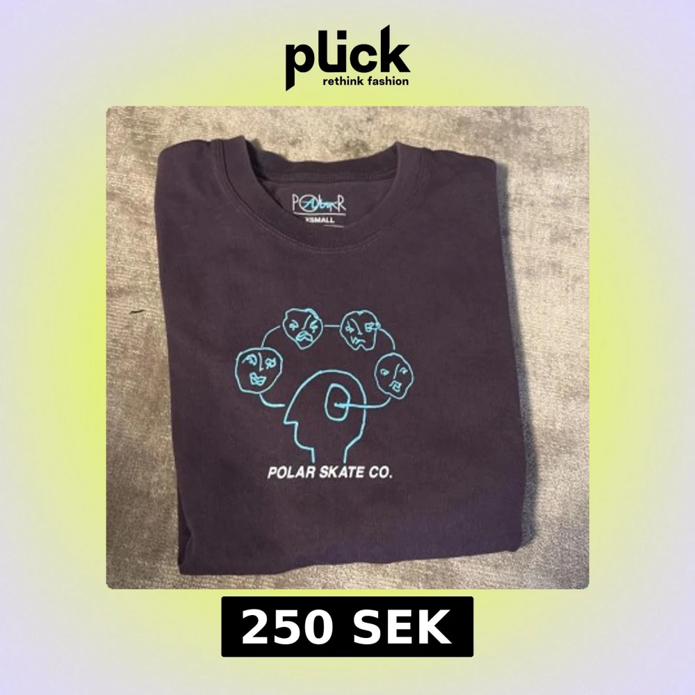 Säljer en svart t-shirt från Polar Skate Co. med ett unikt tryck av ansikten i blått på framsidan. Perfekt för dig som gillar streetwear och vill ha något som sticker ut. T-shirten är kortärmad och gjord i mjukt material.