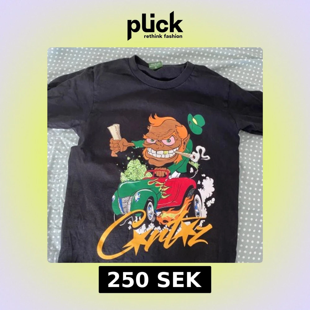 Cool svart t-shirt med färgglatt tecknat tryck av en figur i en grön och röd bil, eldflammor och Critiz-logga i gult. Perfekt för dig som gillar unika och uttrycksfulla plagg.