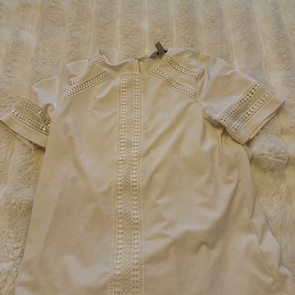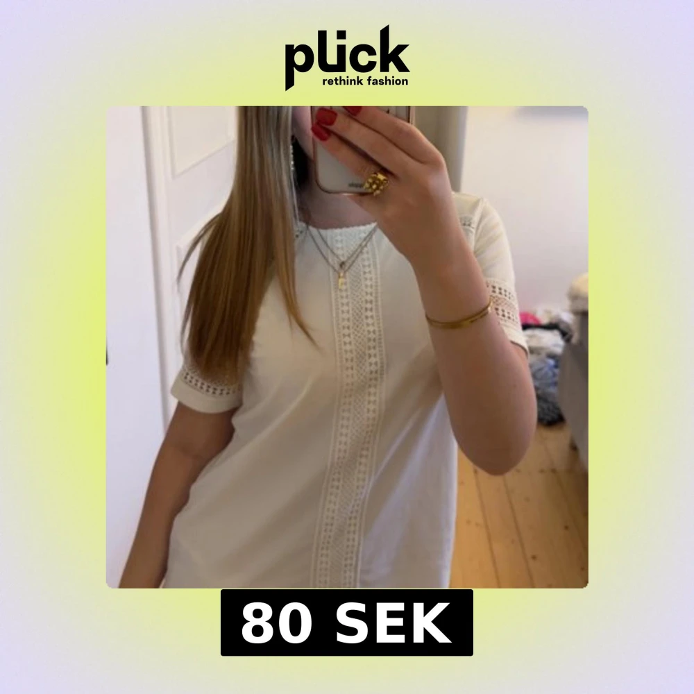 Säljer en vit t shirt med snygga spetsdetaljer längs mitten och på ärmarna. T shirtenhar rund hals och korta ärmar med dekorativa mönster. Perfekt för dig som gillar en clean och fräsch look med lite extra detaljer.