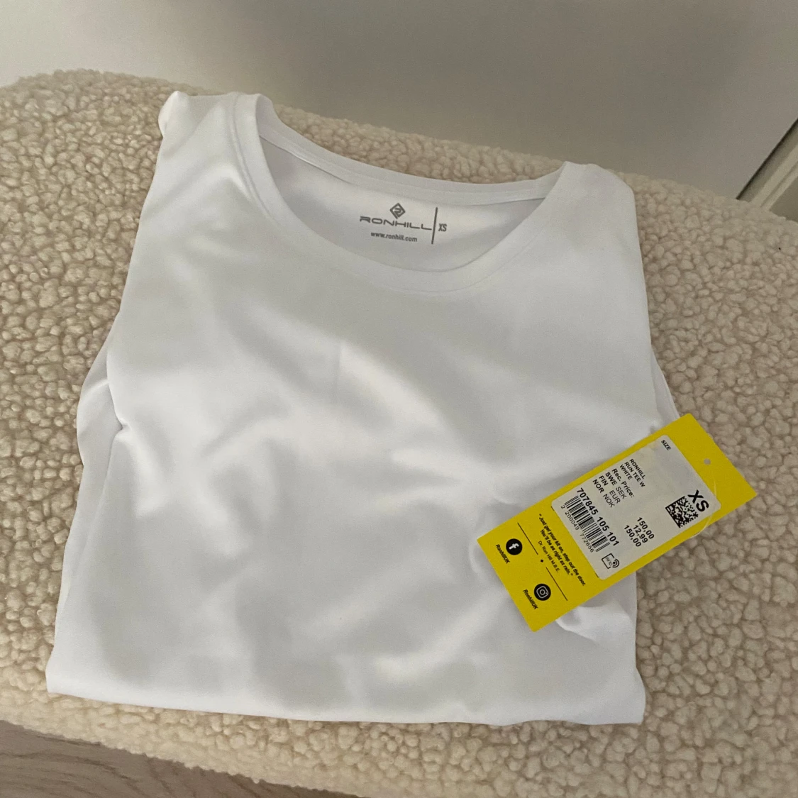 Fräsch vit t-shirt från Ronhill i sportig modell. Tillverkad i lätt och mjuk polyester som andas, perfekt för träning. Klassisk rund halsringning och korta ärmar. Enkel och stilren design utan mönster eller tryck. Helt ny! Aldrig använd! Nypris 180