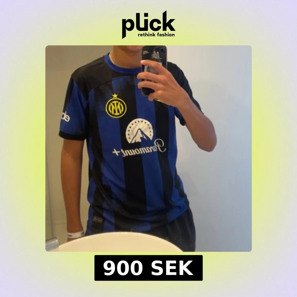 Säljer en äkta Inter Milan tröja som är blå och svart randig Inter fotbollströja med gula och vita loggor på bröstet samt sponsortryck. Tröjan är kortärmad och har en sportig passform, perfekt för match eller träning. Klassisk design med klubbmärke och snygga detaljer.