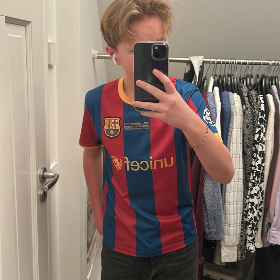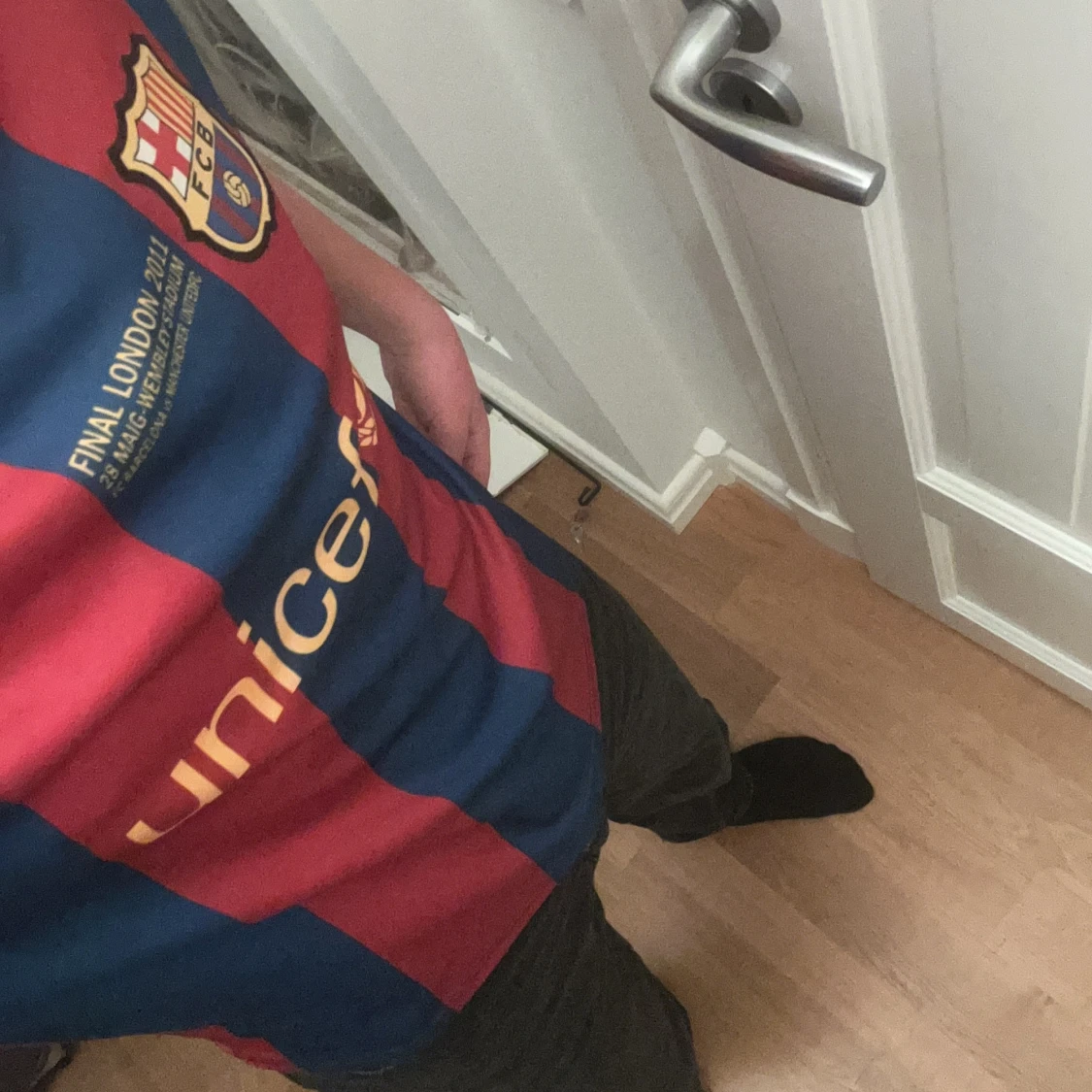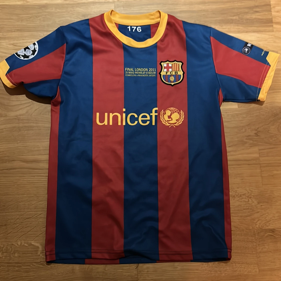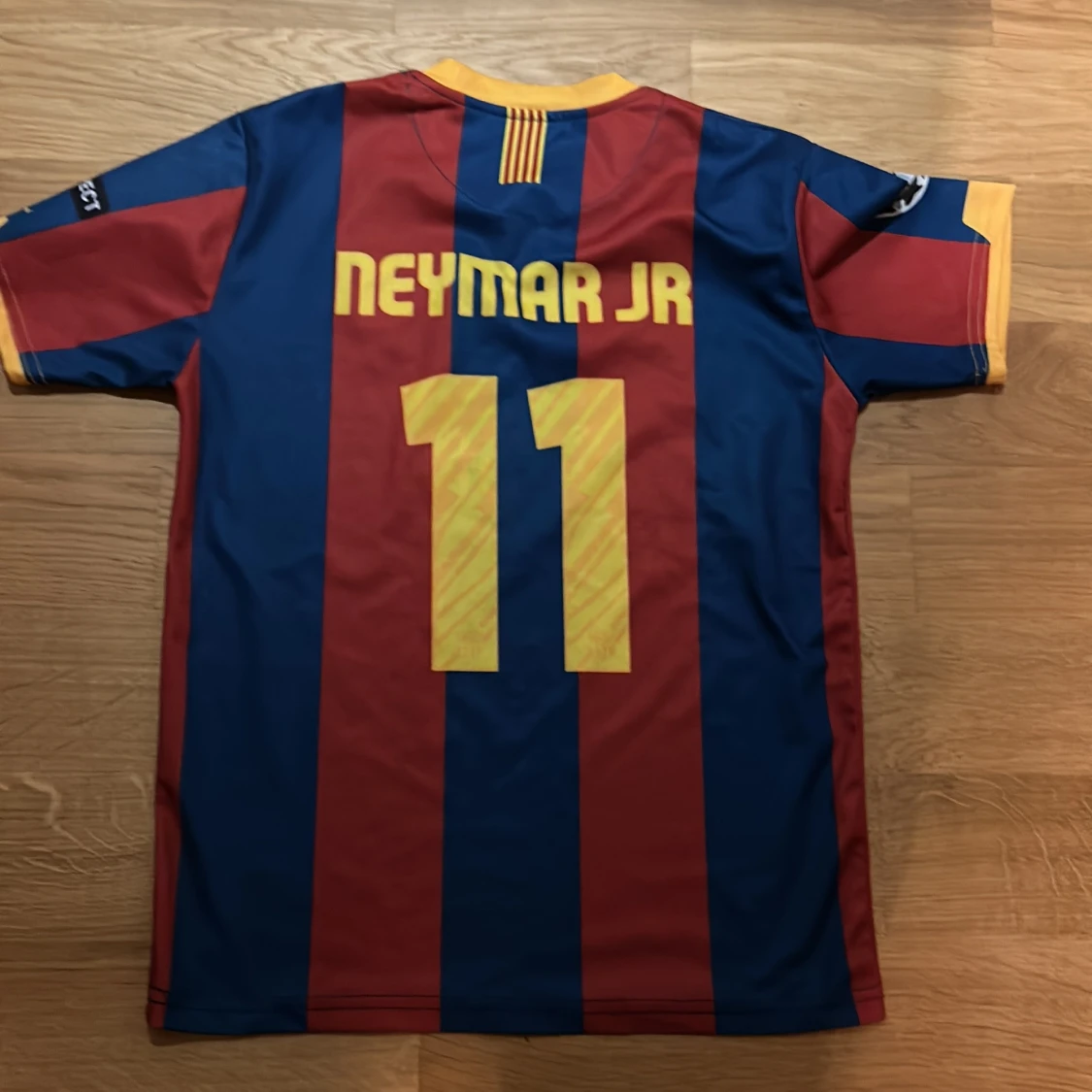 Säljer en blåröd randig fotbollströja från FC Barcelona med Neymar Jr och nummer 11 på ryggen. Tröjan har korta ärmar med gula detaljer och ett tryck av Champions League-loggan på ärmen. Perfekt för fans av laget!