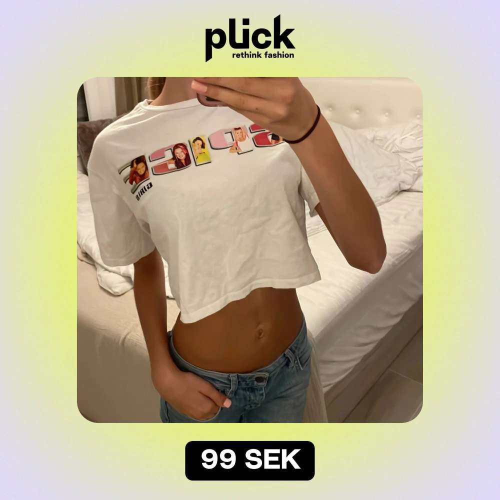 Säljer vit croppad t-shirt med Spice Girls-tryck. T-shirten är kortärmad och gjord i mjuk bomull.