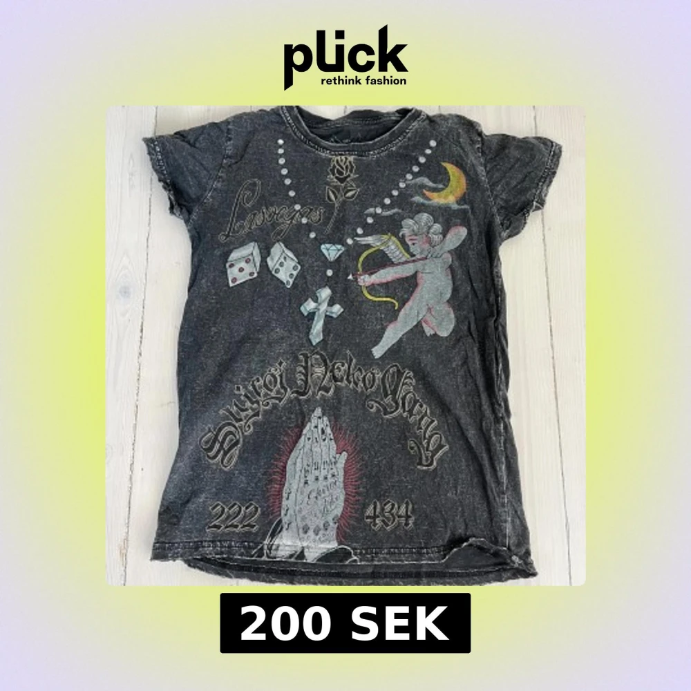 Svart t-shirt från Shiroi Neko Streetgang med coolt tryck fram och bak. Framsidan har motiv med ängel, tärningar, diamant, ros och texten Las Vegas. Baksidan har gul text, ros, krona och kors. T-shirten har korta ärmar och en vintage tvättad look.