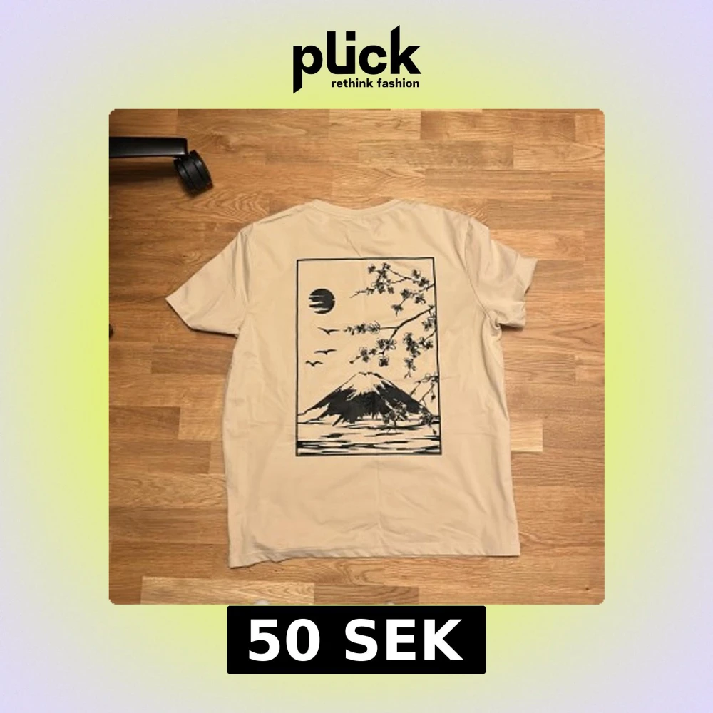 Beige t-shirt från SHEIN i storlek XXL med ett stort svart tryck på ryggen som föreställer ett japanskt landskap med berg, sol, fåglar och blommande grenar. Klassisk rund hals och korta ärmar. Skön och mjuk känsla, perfekt för en chill stil.
