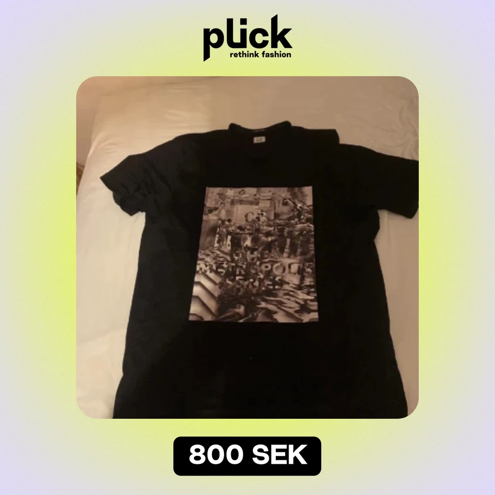 Säljer en svart t-shirt från C.P. Company med ett coolt tryck på framsidan. T-shirten är del av 'The Metropolis Series' och har en normal passform. Perfekt för vardagsbruk eller en avslappnad utekväll. Är storlek XXL men är som en XL