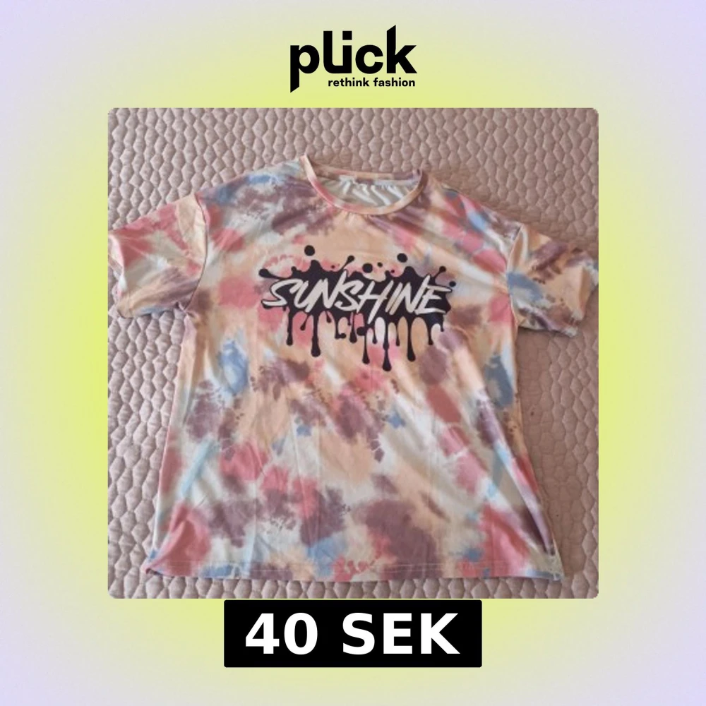 Säljer en färgglad t-shirt med texten 'Sunshine' i svart tryck. T-shirten har ett tie-dye mönster i rosa, blått och beige. Den är kortärmad och har en rund halsringning.