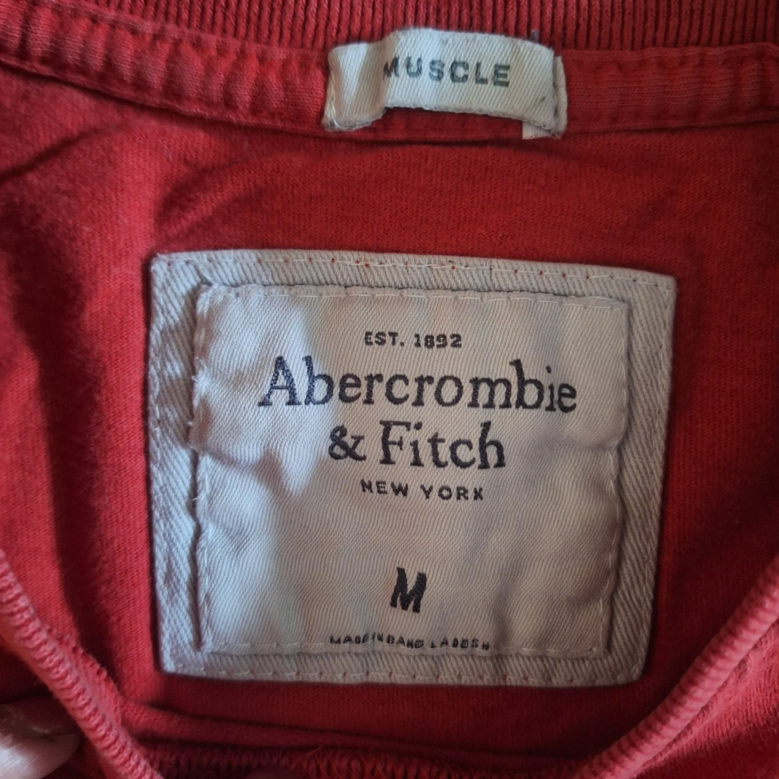 Säljer en cool röd t-shirt från Abercrombie & Fitch i storlek M. Priset kan diskuteras! Tveka inte att skrivaaa😋🫶