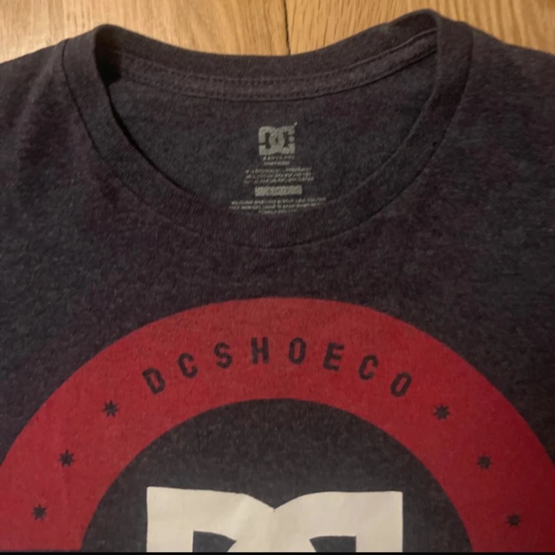 Säljer en mörkgrå t-shirt från DC Shoes med ett stort tryck i rött och vitt på framsidan. T-shirten har korta ärmar och en rund halsringning.