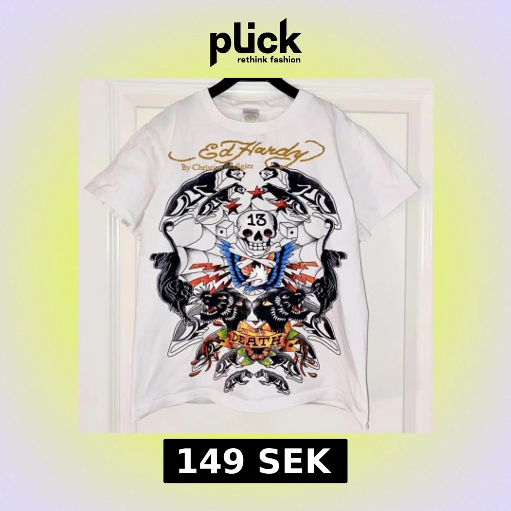 Säljer en vit Ed Hardy t-shirt med stort färgstarkt dödskalle- och panterprint på framsidan, samt guldigt logotryck både fram och bak⭐️Det finns små deoderantfläckar under vardera arm (se bild 4). Axelbredd 37cm, längd 50cm.