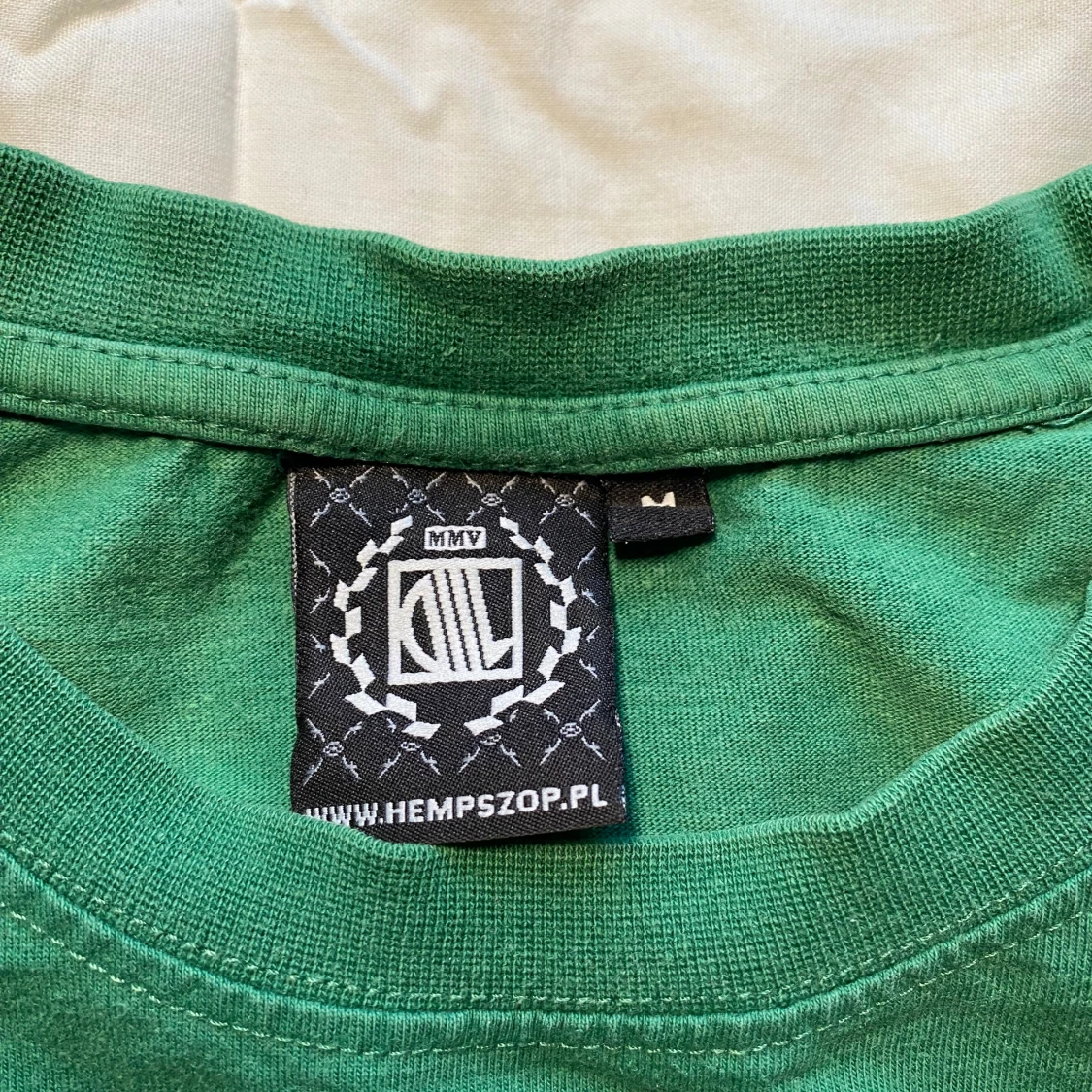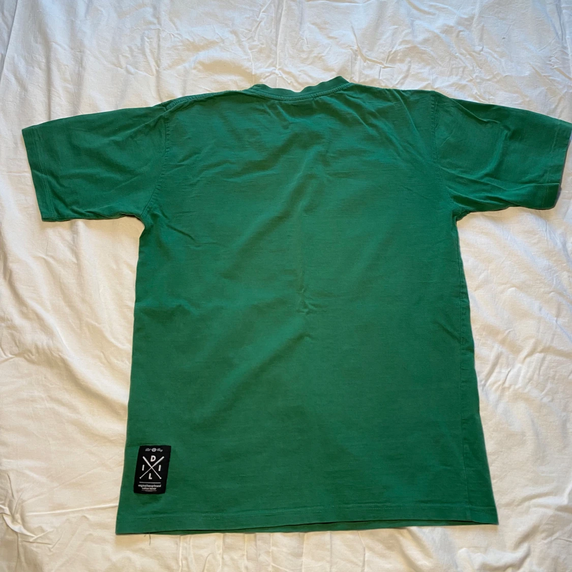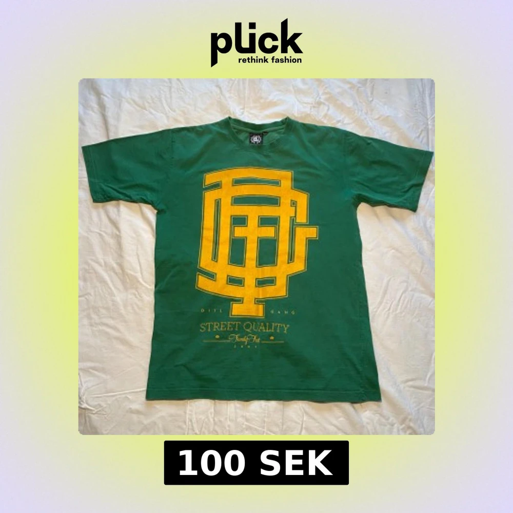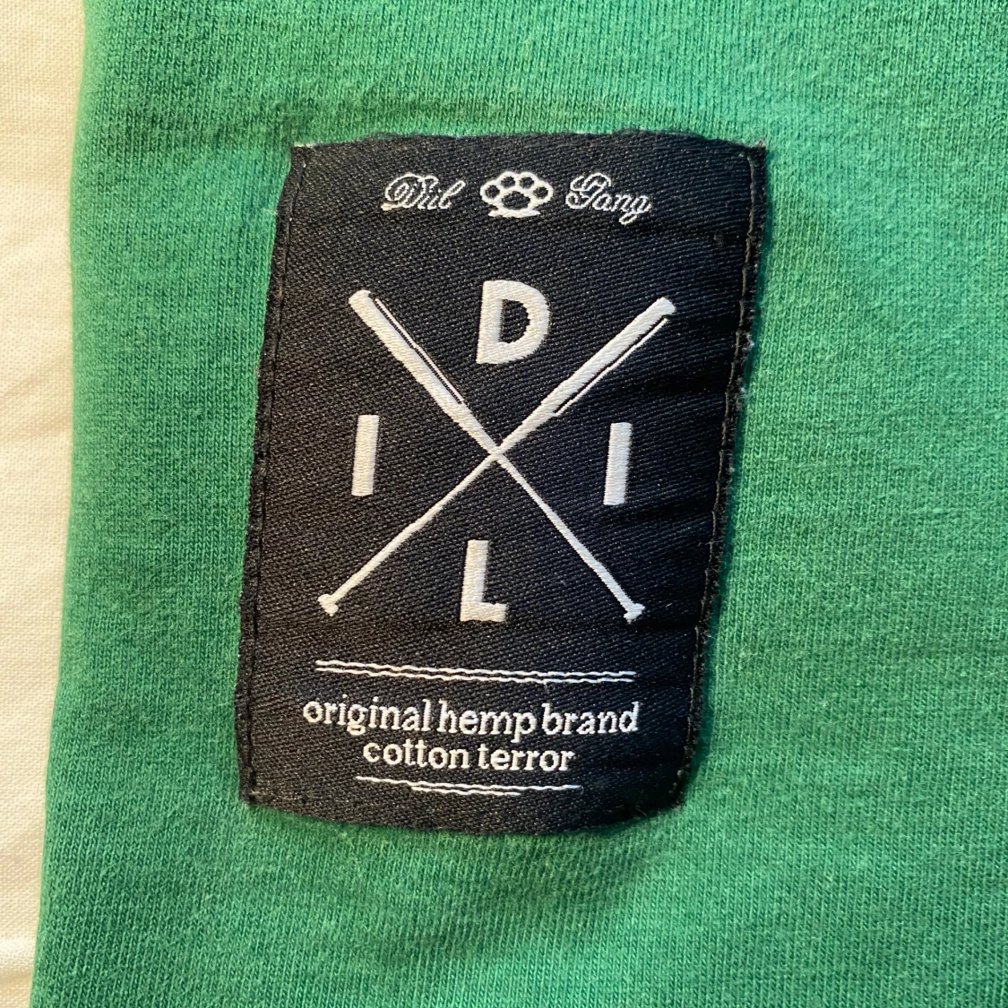 Säljer en grön t-shirt från DIL med ett stort gult grafiskt tryck på framsidan. T-shirten är kortärmad och tillverkad av ett hampabaserat material. Perfekt för en avslappnad streetwear-look.