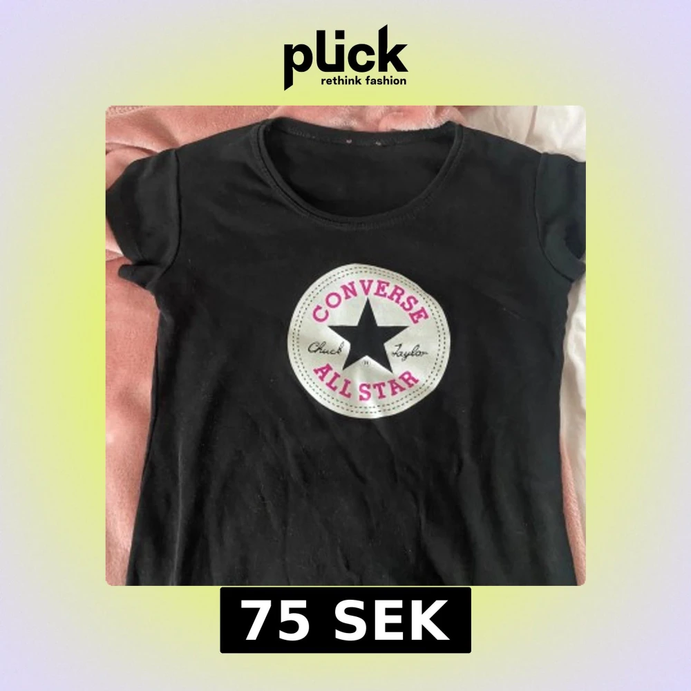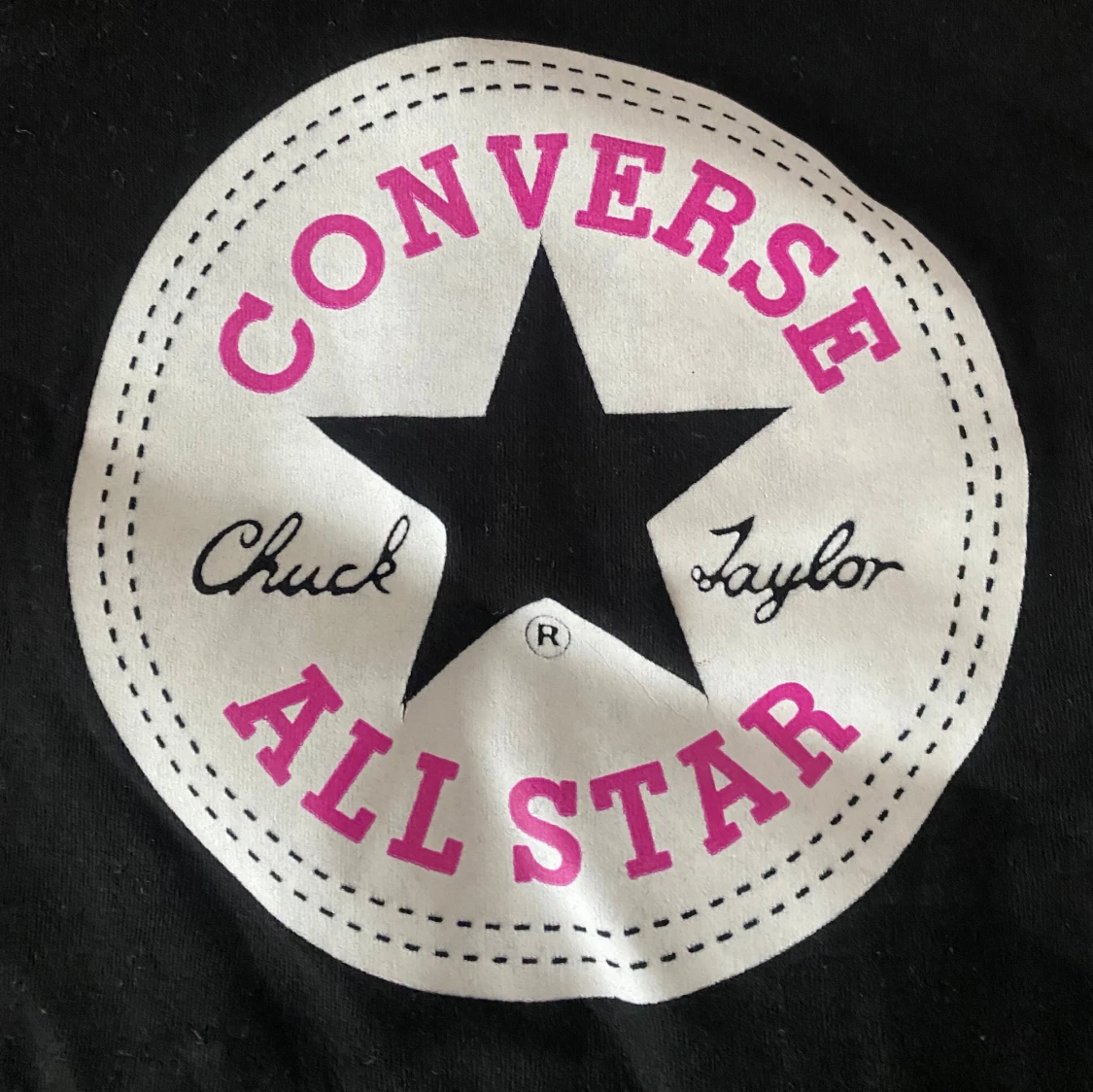 Säljer en svart t-shirt från Converse med det klassiska All Star-logotypen i vitt och rosa på framsidan. T-shirten har en rund halsringning och korta ärmar. Perfekt för en avslappnad stil!