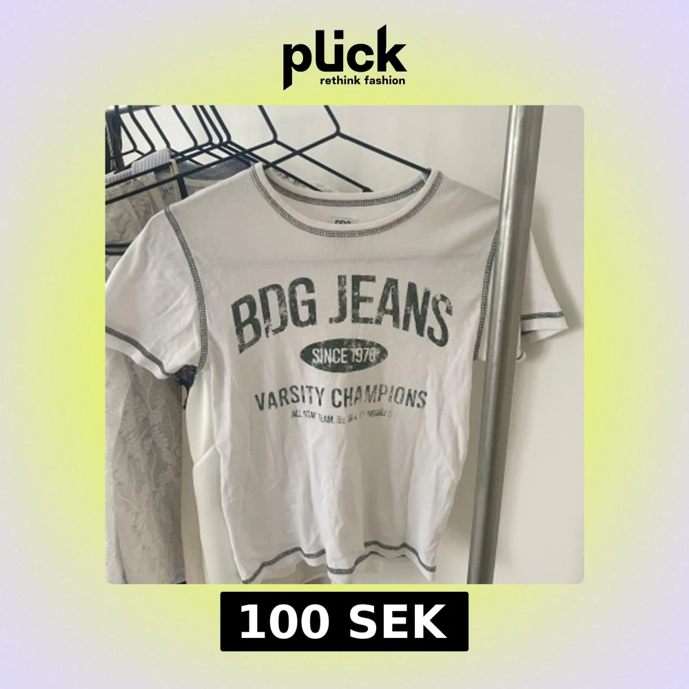 Snygg vit t-shirt från BDG Urban Outfitters med grönt tryck och gröna kontrastsömmar. Sparsamt använd. Kan mötas upp i Sthlm, annars står köparen för frakten 💕