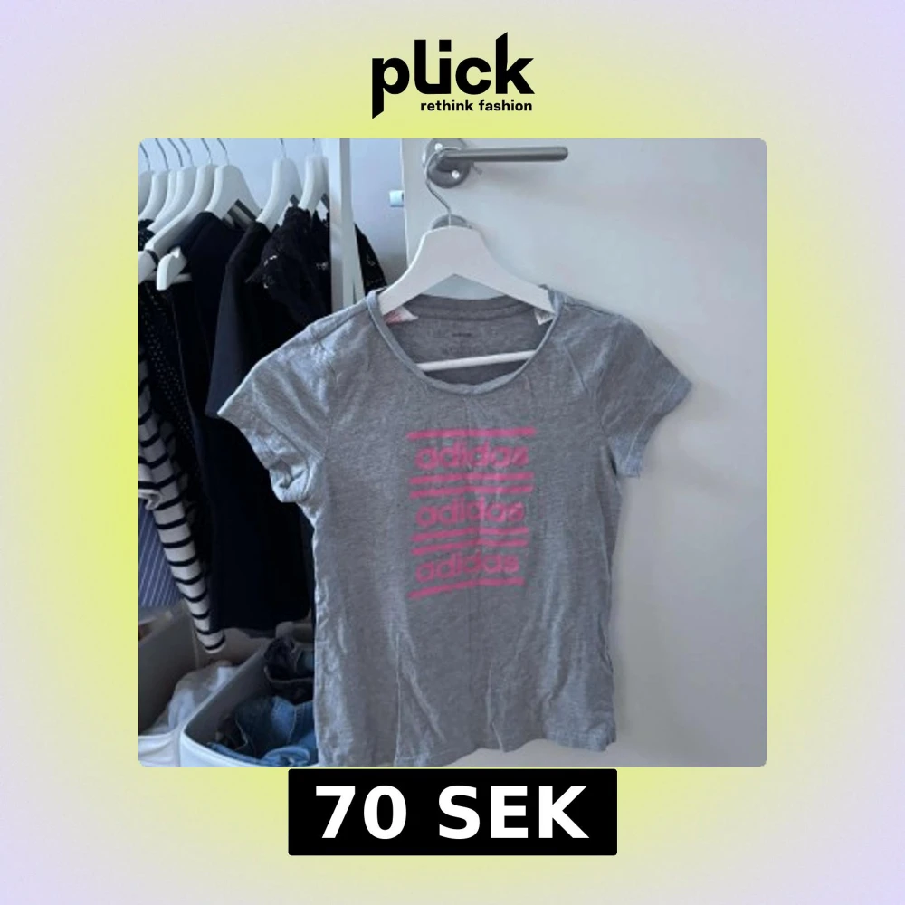 Snygg grå t-shirt från Adidas med korta ärmar och rund hals. Framsidan har ett coolt rosa Adidas-tryck i flera rader. Perfekt för en sportig och avslappnad stil. Mjuk och skön bomullskänsla.