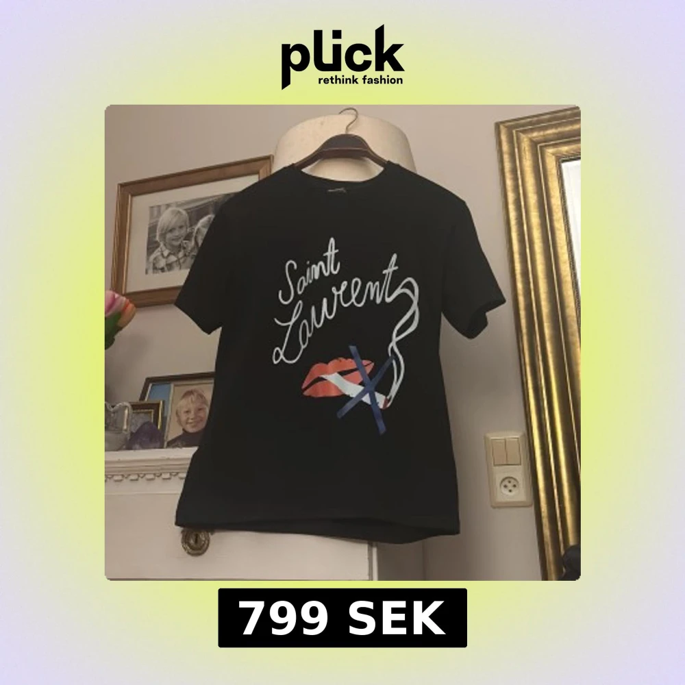 Snygg svart t-shirt från Saint Laurent med ett coolt tryck av röda läppar och texten 'Saint Laurent' i vitt. Perfekt för en trendig look. Tröjan är extraordinär och har det lilla extra i sig, väldigt charmig och kan användas när som helst i din vardag. Fler frågor via DM ! 👇
