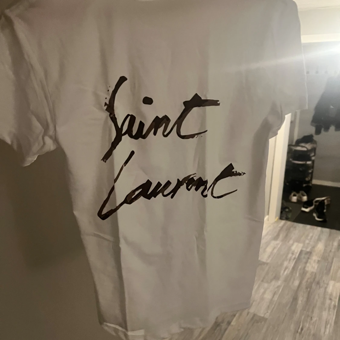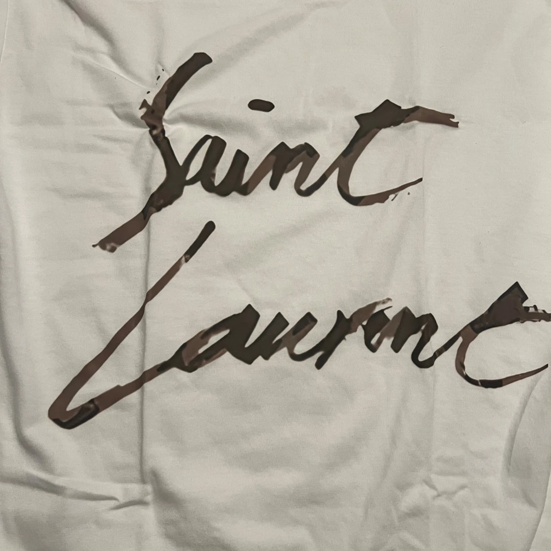 Vit t-shirt från Saint Laurent med stort svart handskrivet logotyptryck på ryggen. Klassisk passform och rund hals. Perfekt för dig som vill ha en clean look med exklusiv känsla.