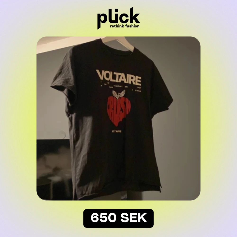 Zadig & Voltaire t-shirt. Modellen ser ut som ”avklippta” armar och där nere. Färg: Grå/svart 🩶❤️ Coolt tryck fram & bak. Glitter & rött. Helt ny, använd fåtal gånger.