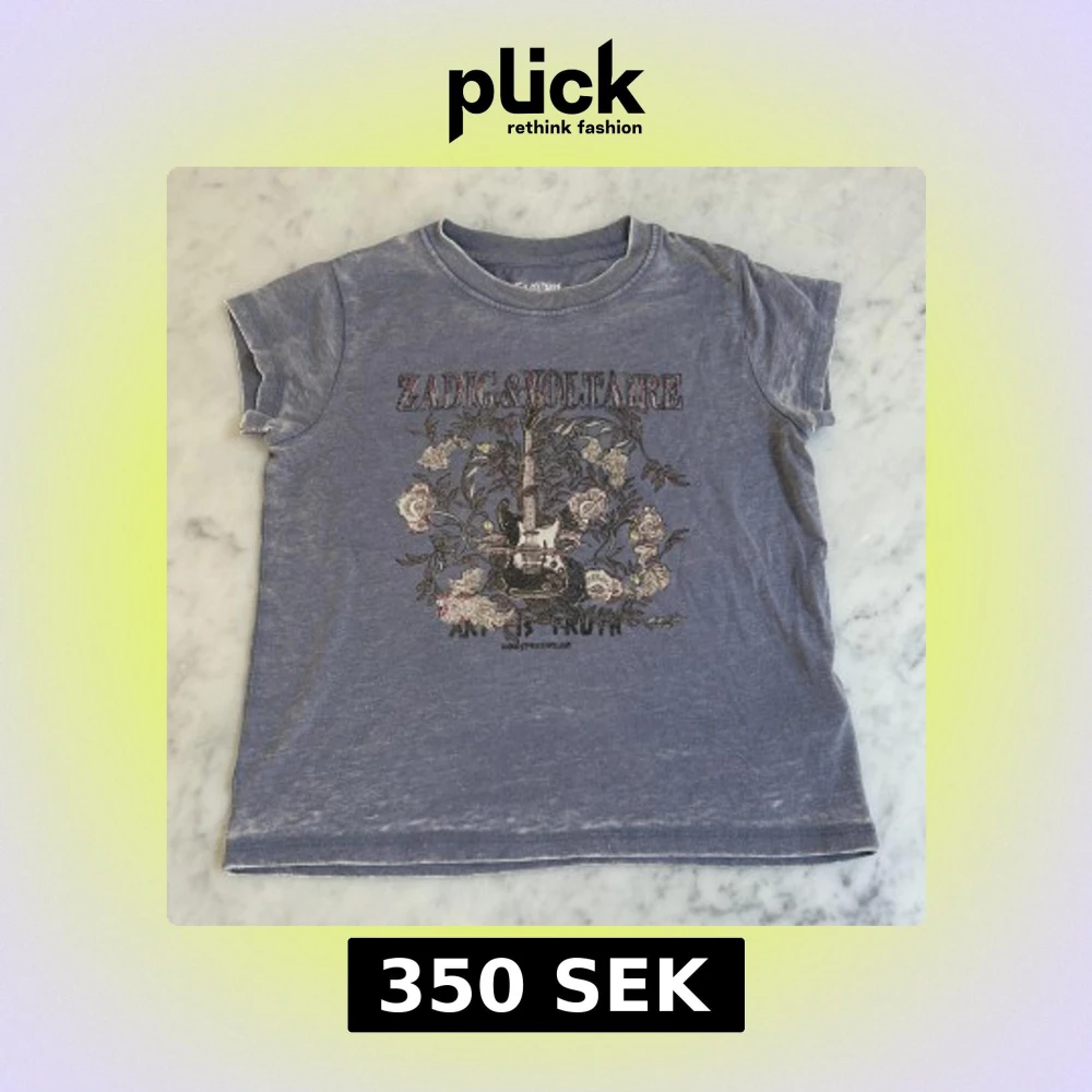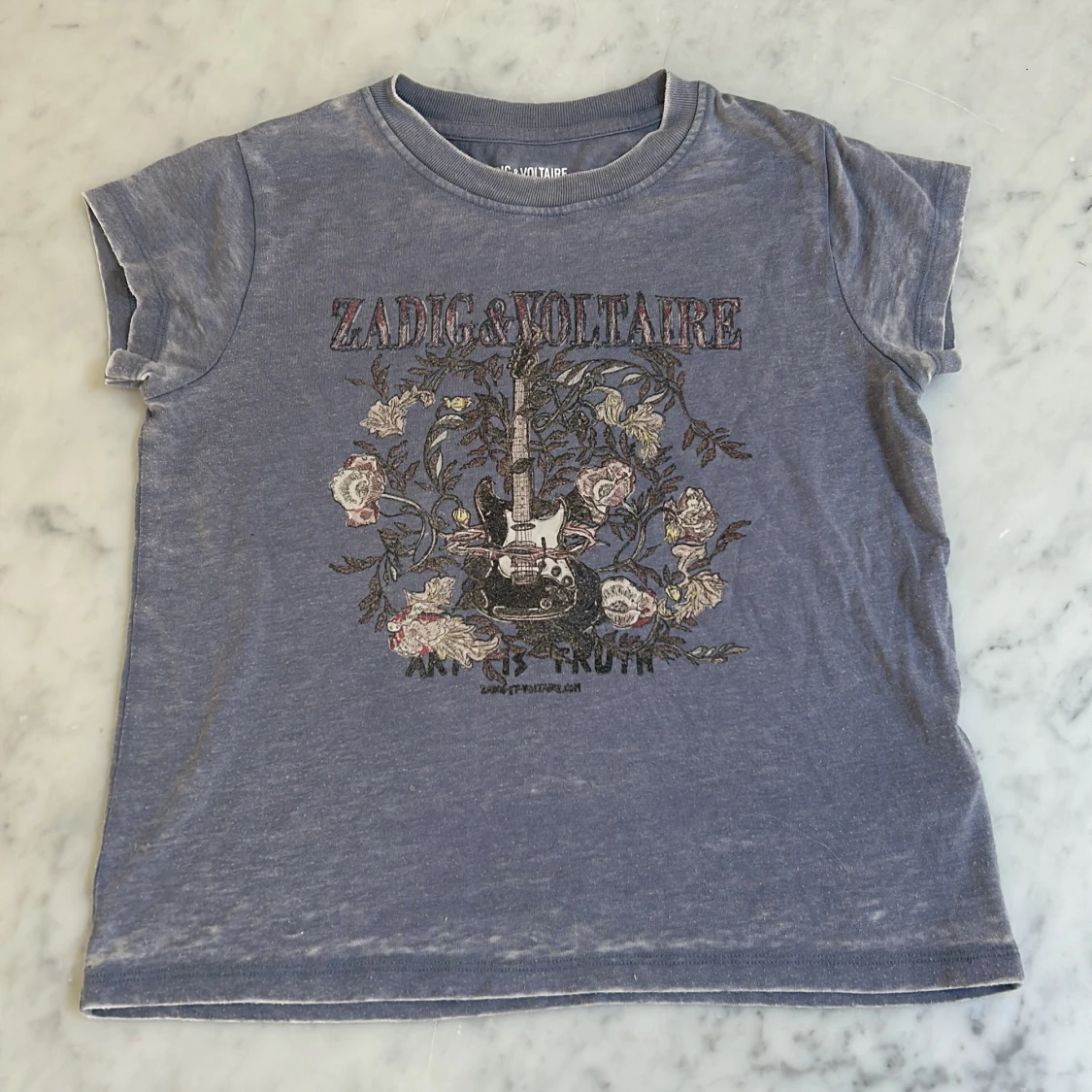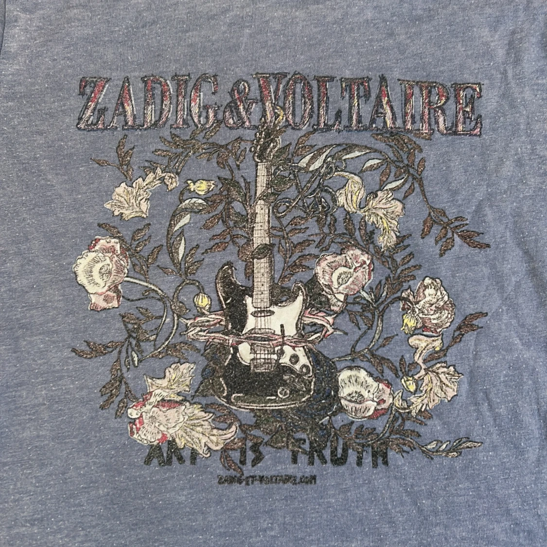 Blå t-shirt från Zadig & Voltaire i storlek XS med coolt tryck av elgitarr och blommor på bröstet. T-shirten har korta ärmar, rund halsringning och är gjord i mjuk bomull. Perfekt för dig som gillar rockig stil med en twist.