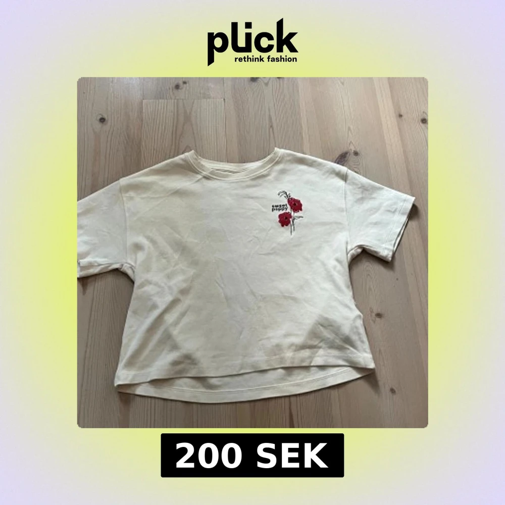 Säljer en beige t-shirt med kort ärm och tryck av röda blommor samt texten 'sweet poppy' framtill. På ryggen står det 'Adore Flowers' i broderad stil. Skön passform och tillverkad i mjuk bomull. Perfekt för dig som gillar blommiga detaljer och chill vibe.
