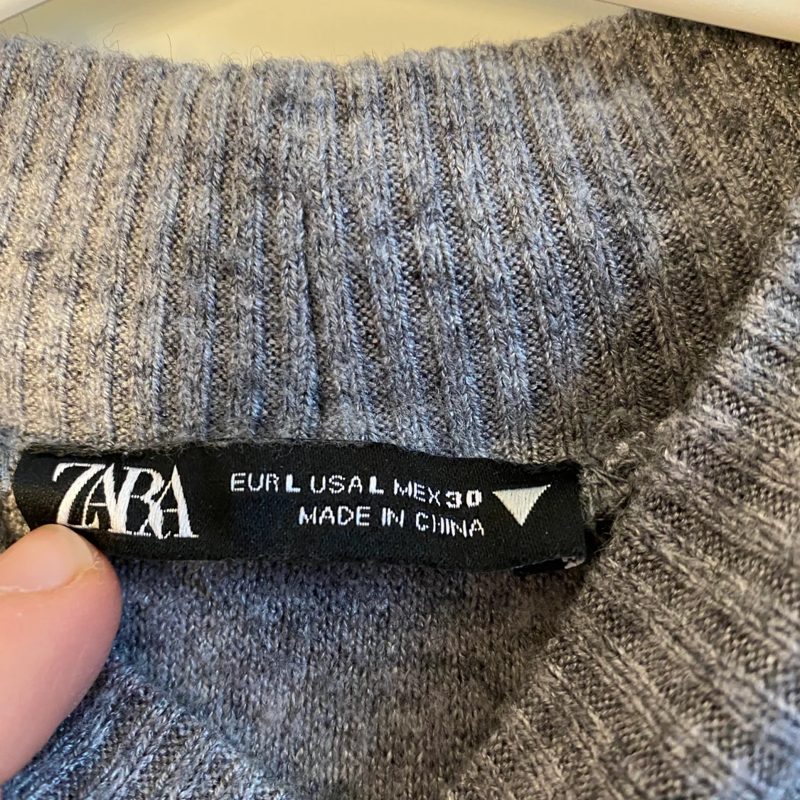 Supersnygg grå stickad tröja från Zara. Använd endast ett fåtal gånger, så är som nyskick. Storlek L men skulle säga att den är S då den är väldigt liten i storleken