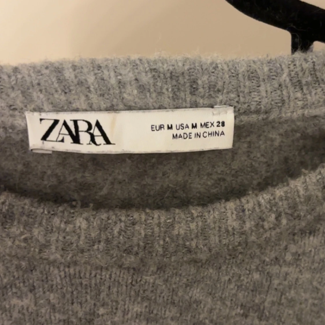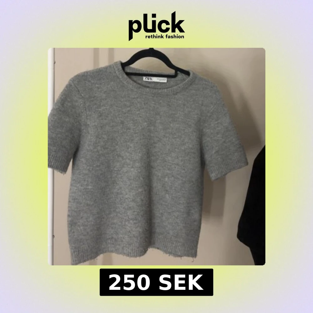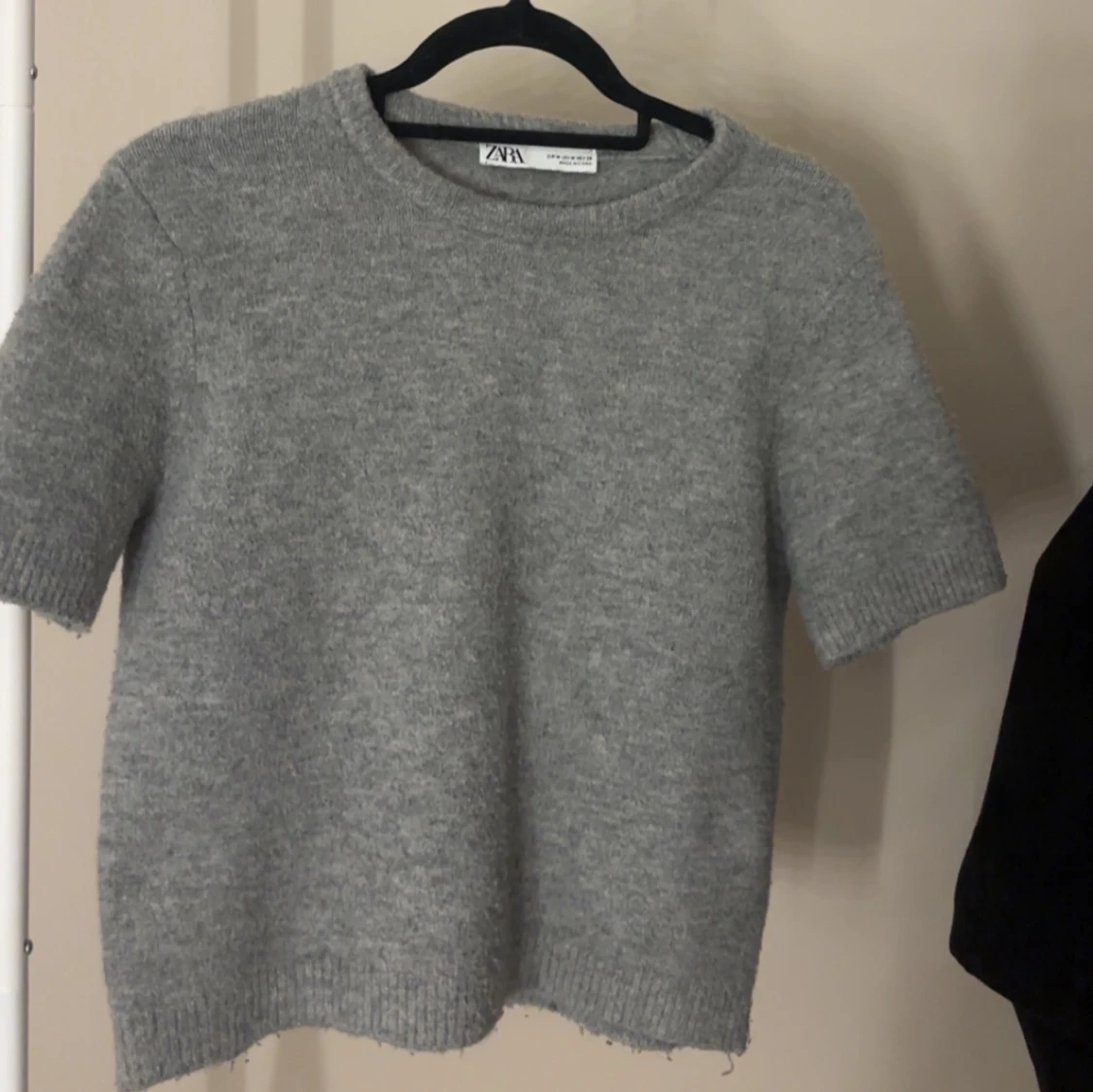 Säljer en enkel och stilren grå stickad tröja från Zara i storlek M. Tröjan har korta ärmar, rund hals och ribbade kanter vid ärmslut och nederkant.
