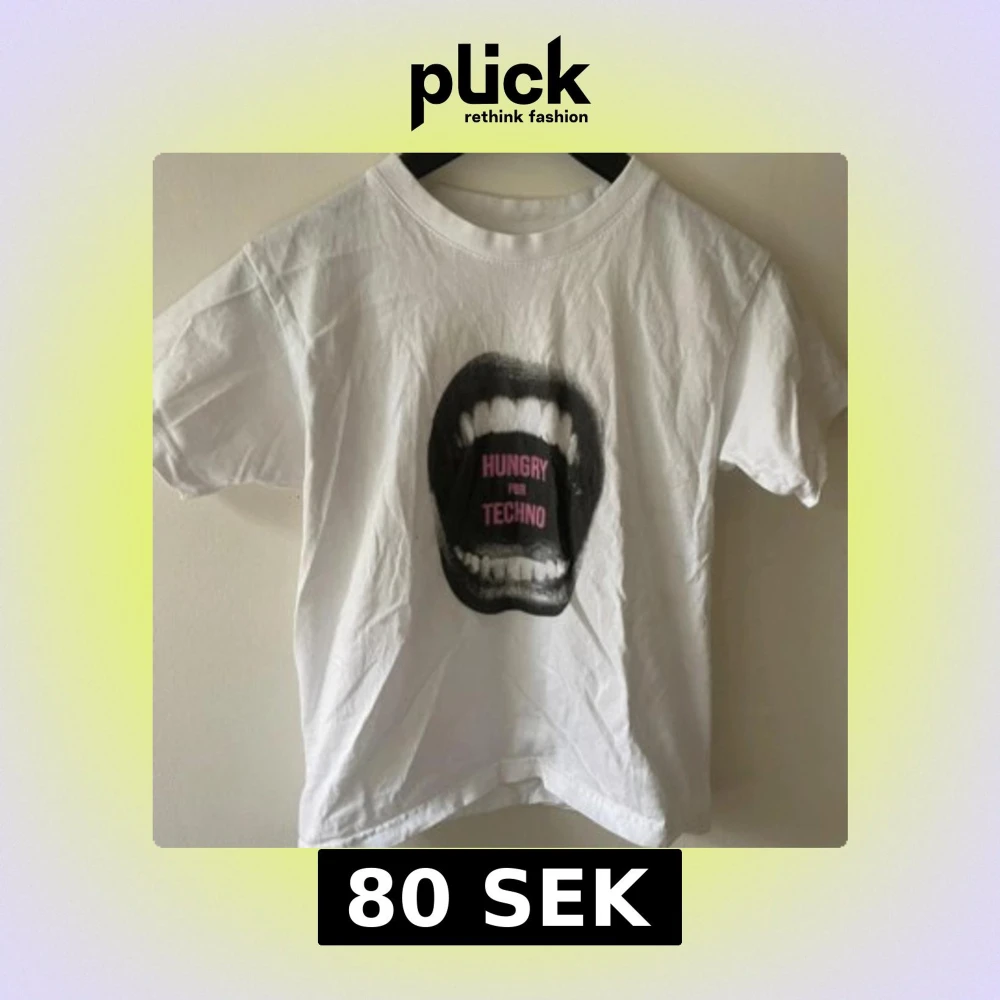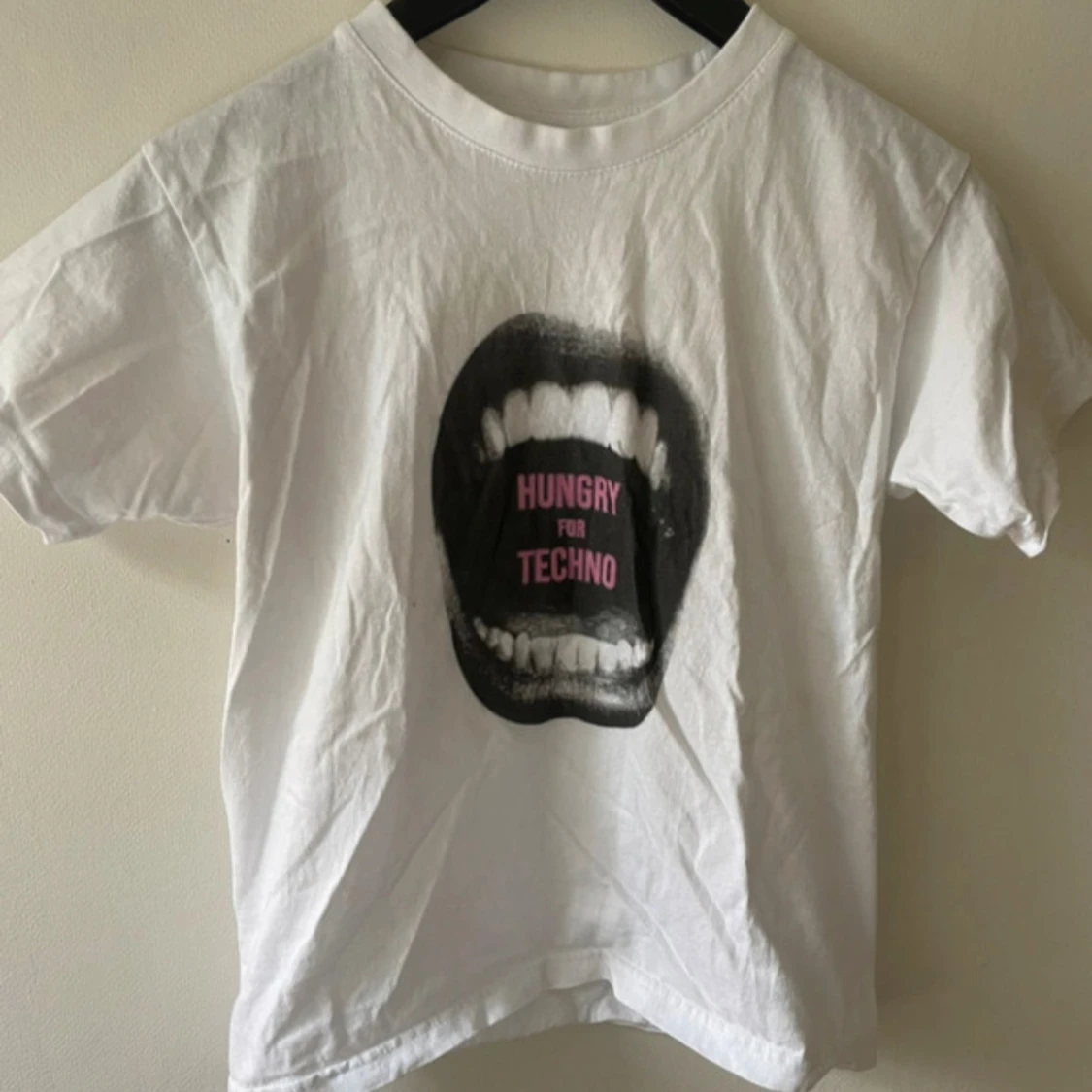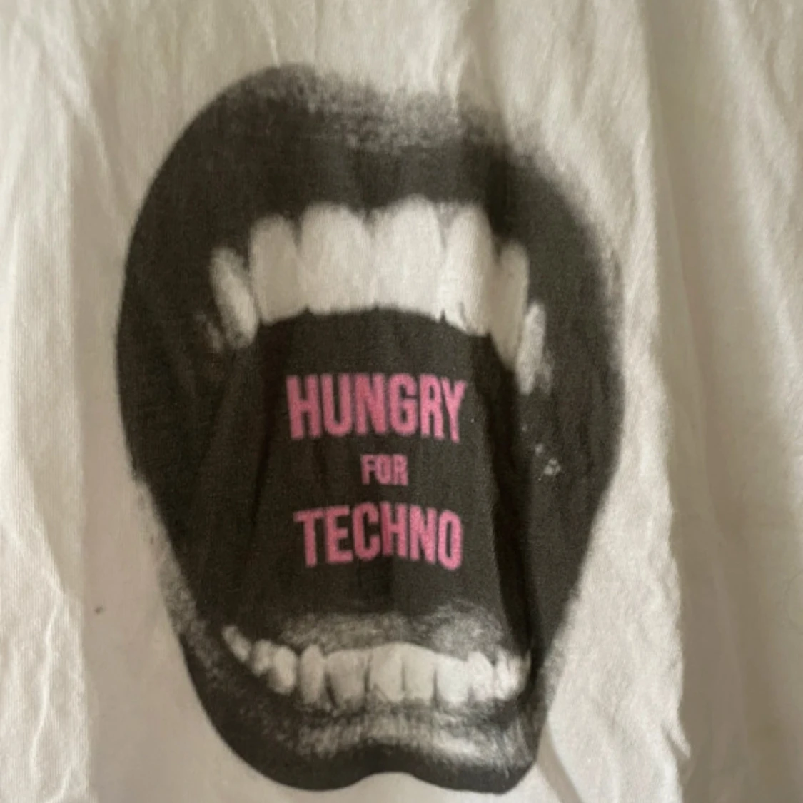 Snygg vit t-shirt med tryck av en öppen mun och texten 'HUNGRY FOR TECHNO' i rosa. Klassisk rund hals och korta ärmar, perfekt för dig som gillar statement-plagg och elektronisk musik. Materialet känns som bomull och passformen är normal.
