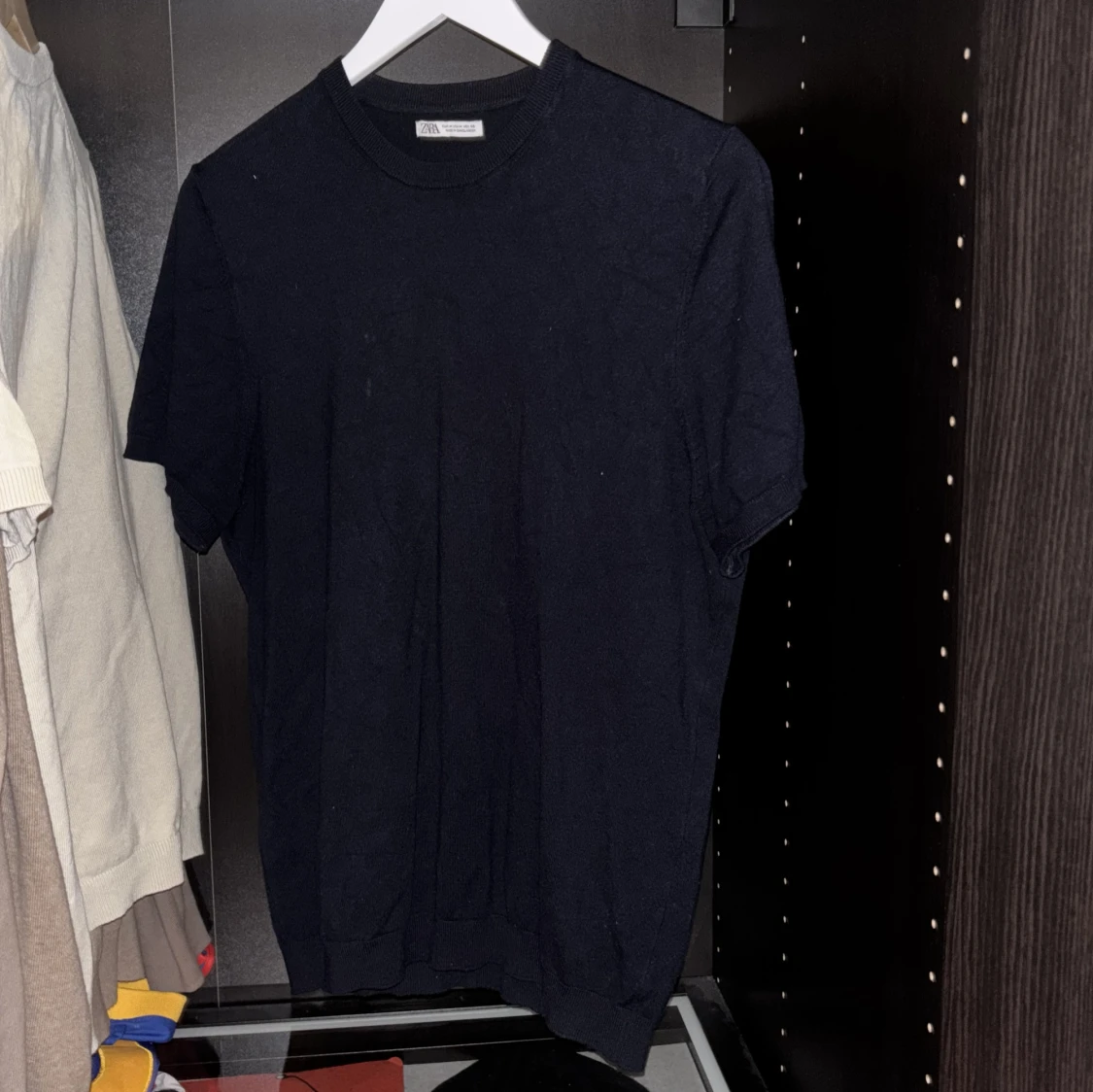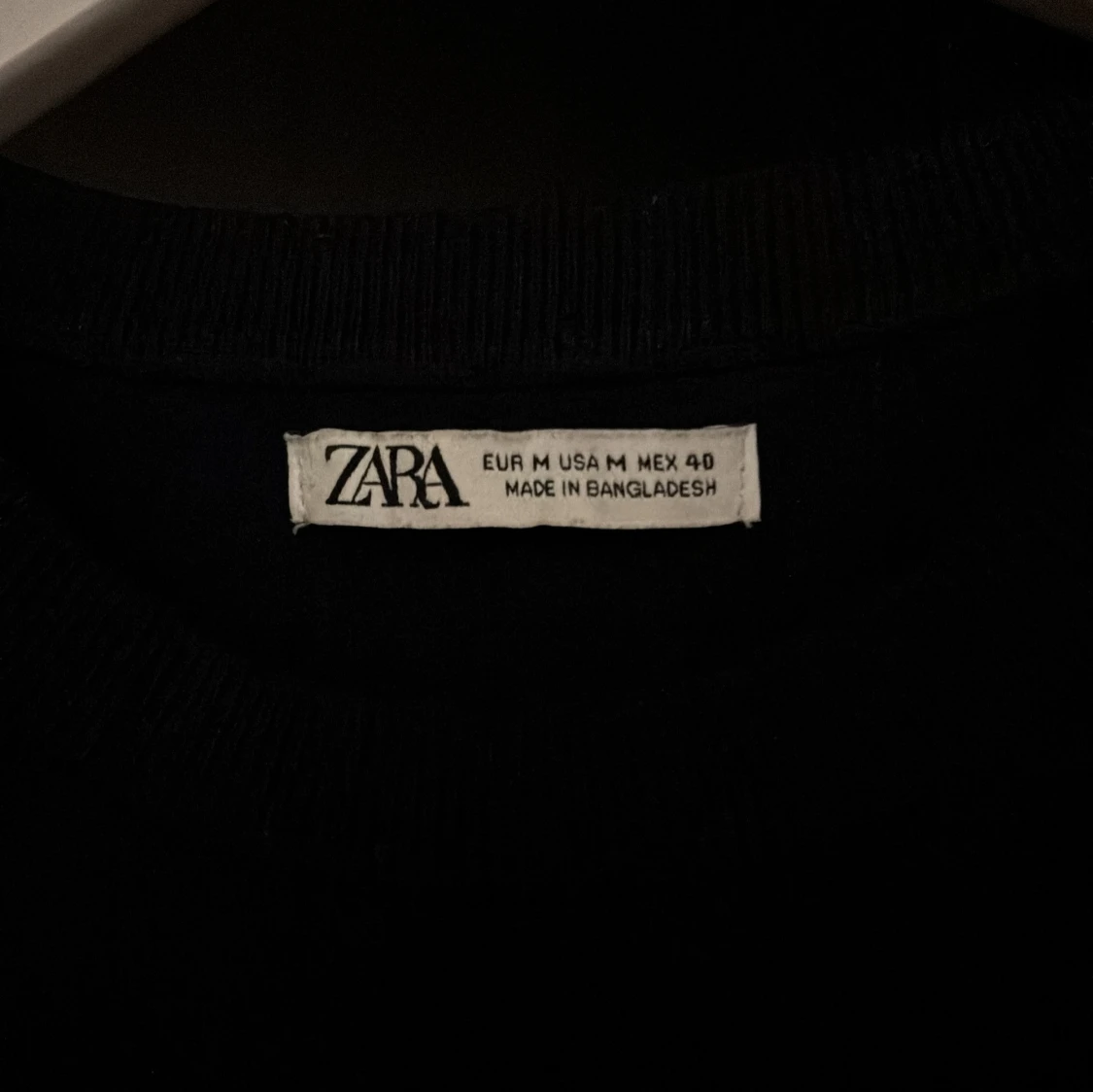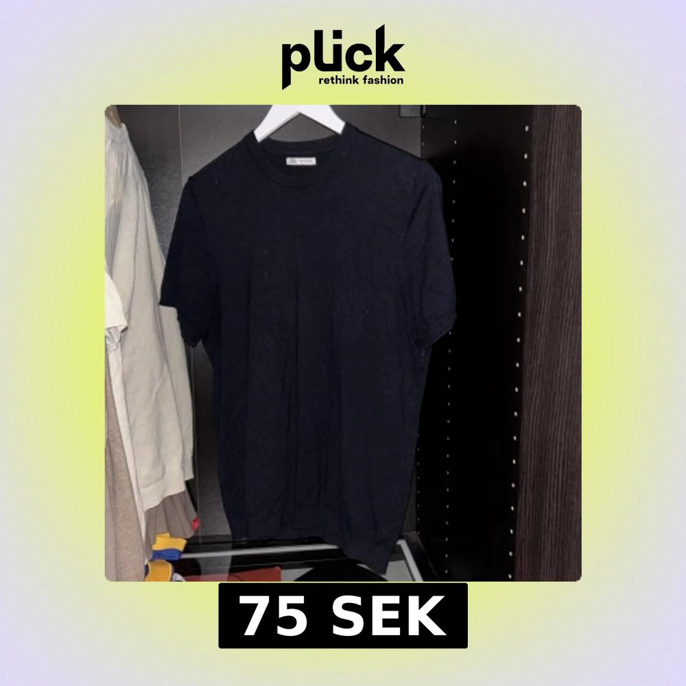 Säljer en klassisk mörkblå t-shirt från Zara. Den har en enkel design med rund hals och korta ribbade ärmar, perfekt för en stilren look. Inga tecken på användning, skriv vid funderingar eller annat