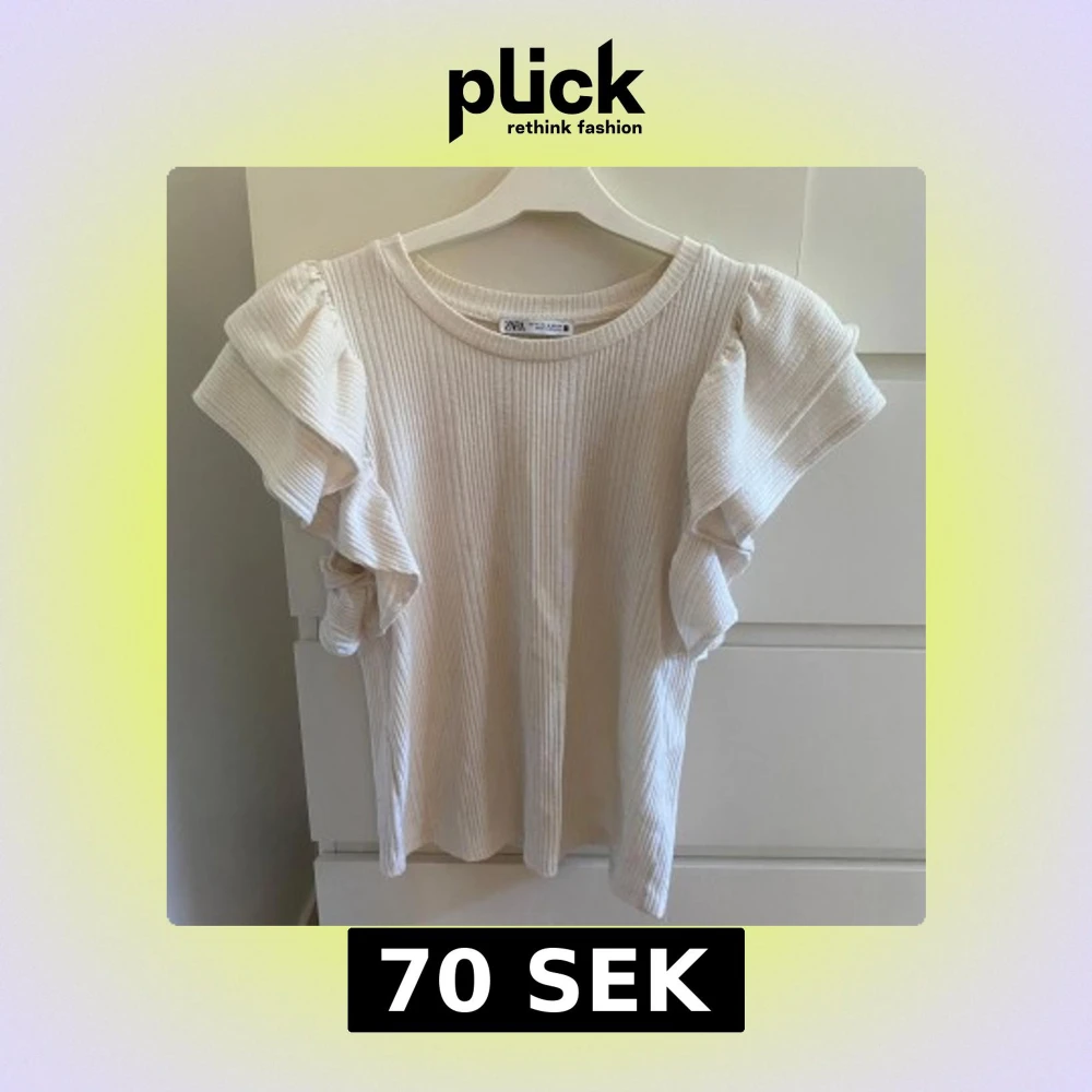 Supersöt vit topp från Zara med ribbad struktur och stora volangärmar som ger en extra touch. Rund halsringning och mjukt material som känns skönt mot huden. Perfekt för dig som gillar en mjuk och stilig tröja!