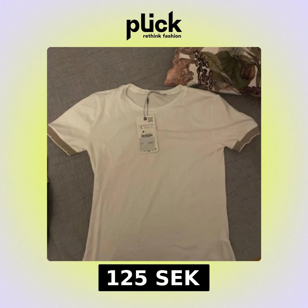 Vit t-shirt i bomull med korta ärmar och rund hals. Ärmsluten har en beige ribbad kant med dekorativ spetsdetalj som ger en söt och unik touch. Perfekt för dig som gillar stilrena plagg med en twist. Aldrig använd!
