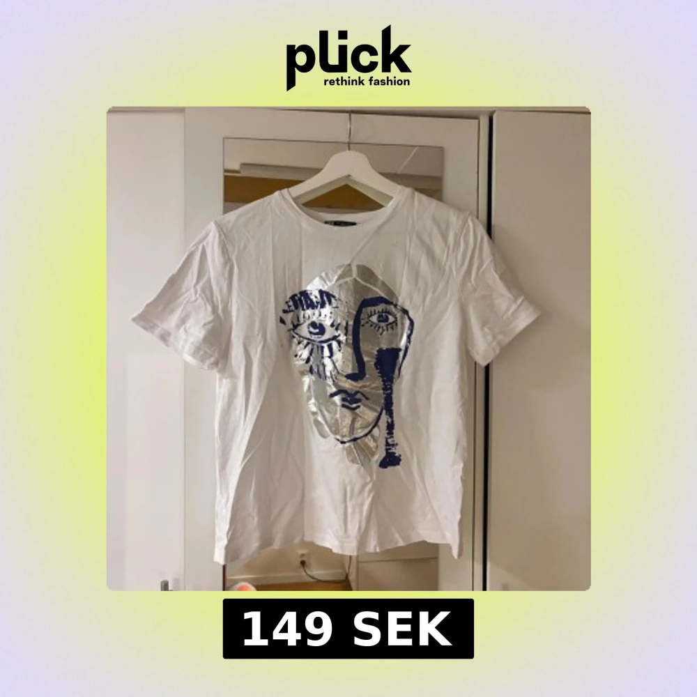 Vit t-shirt från Zara i bomull med korta ärmar och ett stort konstnärligt ansikte tryckt i silver och mörkblått framtill. Skön passform och cool design som sticker ut. Perfekt för dig som gillar unika prints och streetstyle.