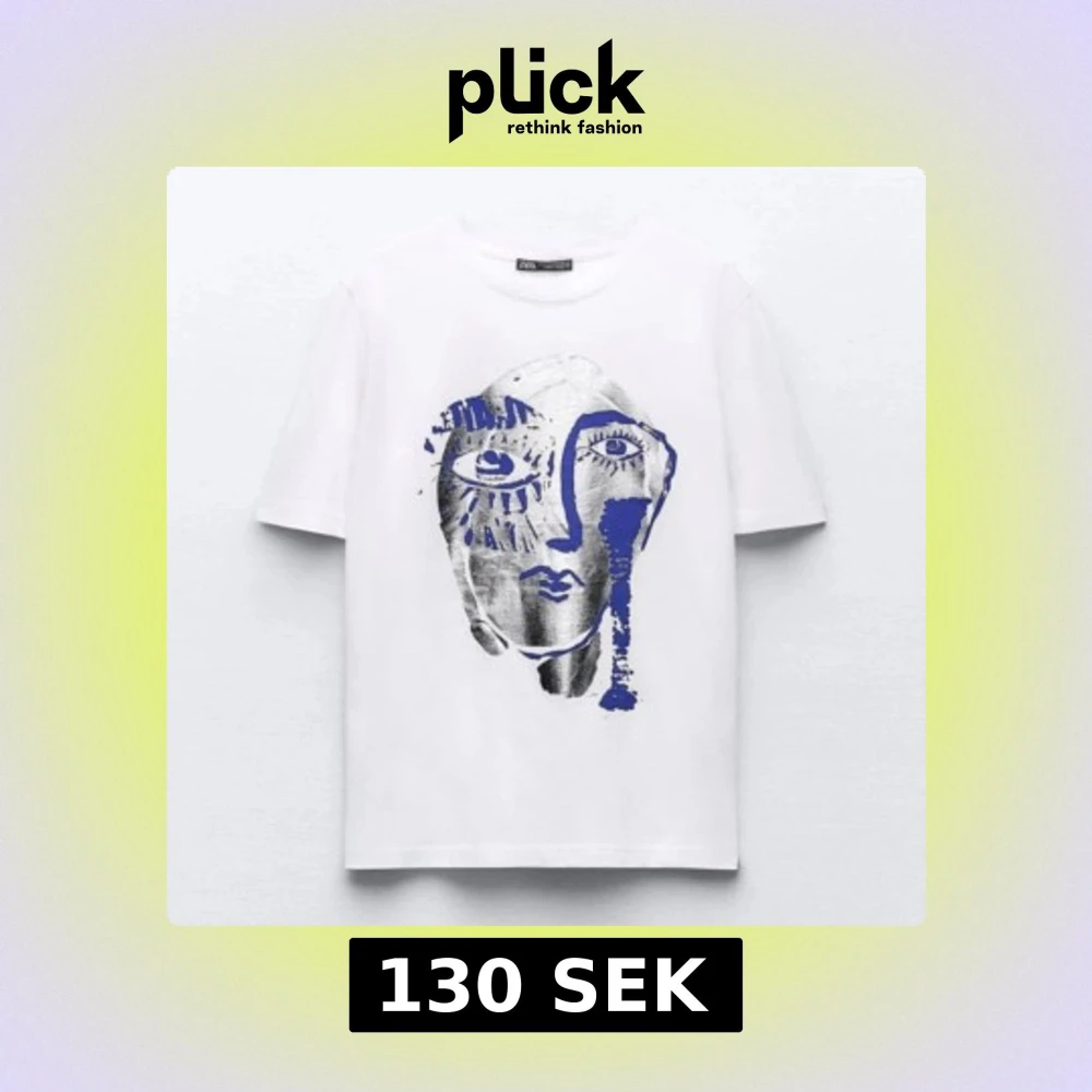Vit t-shirt från Zara med ett stort konstnärligt ansiktstryck i silver och blått på framsidan. Klassisk rund halsringning och korta ärmar. 🫐🫐