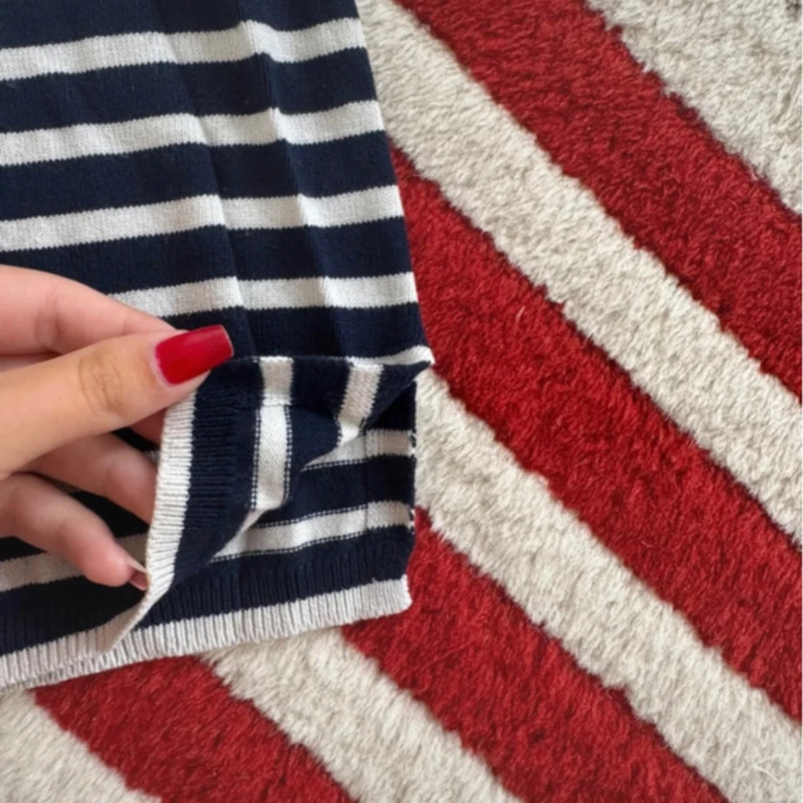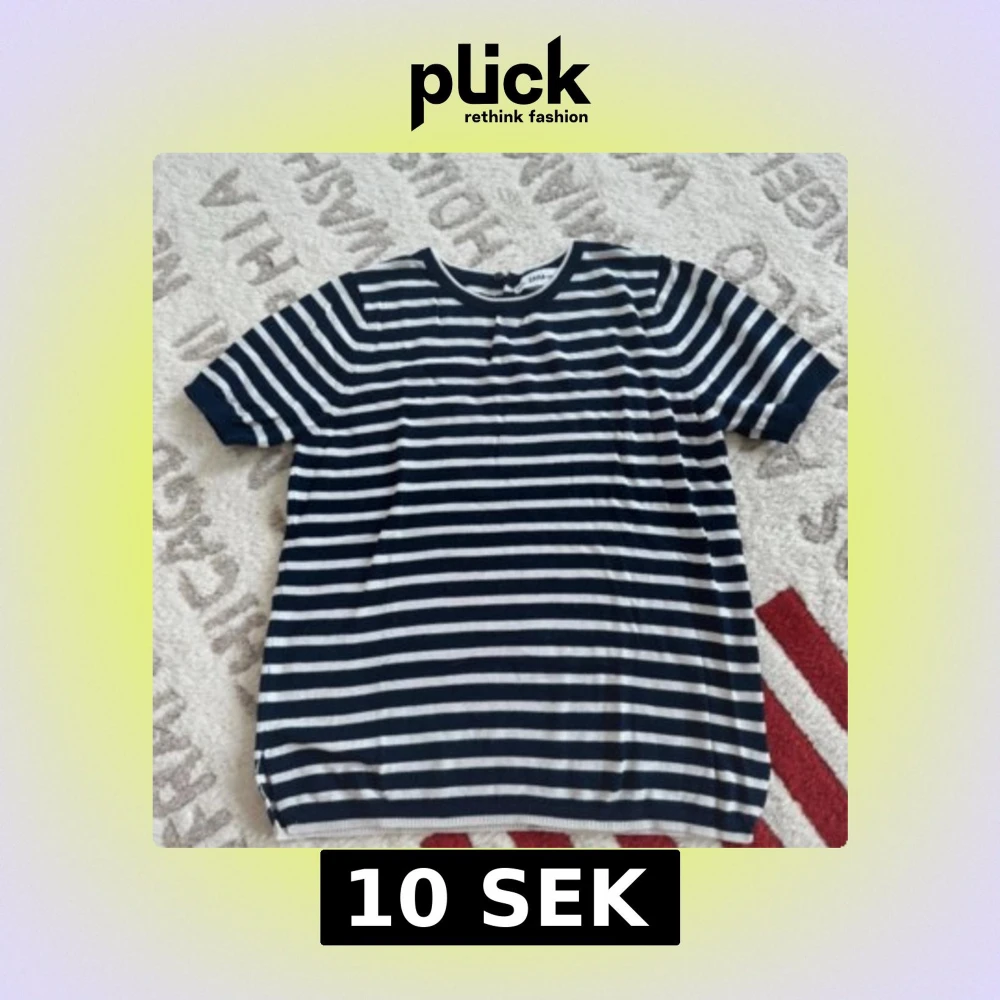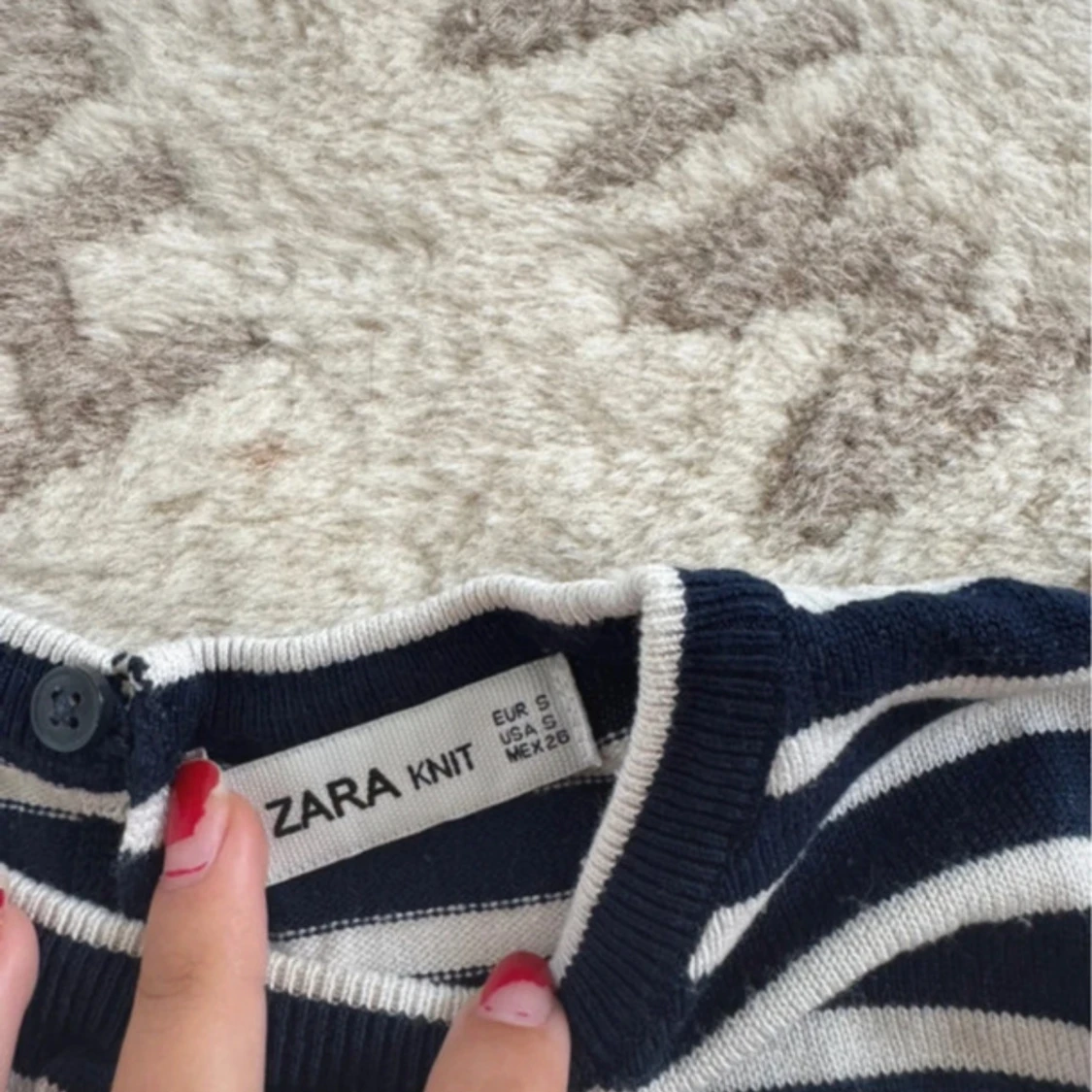 Säljer en stickad t-shirt från Zara i marinblått och vitt med klassiskt randigt mönster. T-shirten har korta ärmar, rund halsringning och liten slits i sidan. Perfekt för dig som gillar en chill och stilren look.