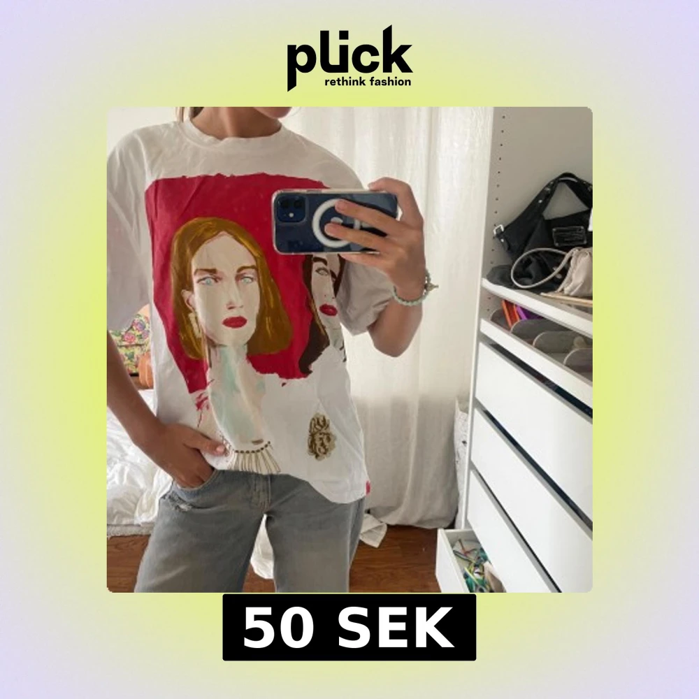 Vit oversize t-shirt från Zara med stort konstnärligt tryck på framsidan som föreställer två ansikten mot en röd bakgrund. T-shirten har rund hals och korta ärmar. Materialet är mjuk bomull och passformen är loose. Perfekt för dig som gillar unika prints och vill sticka ut.