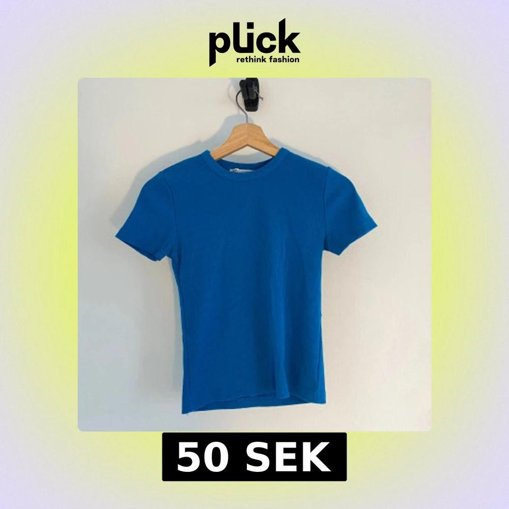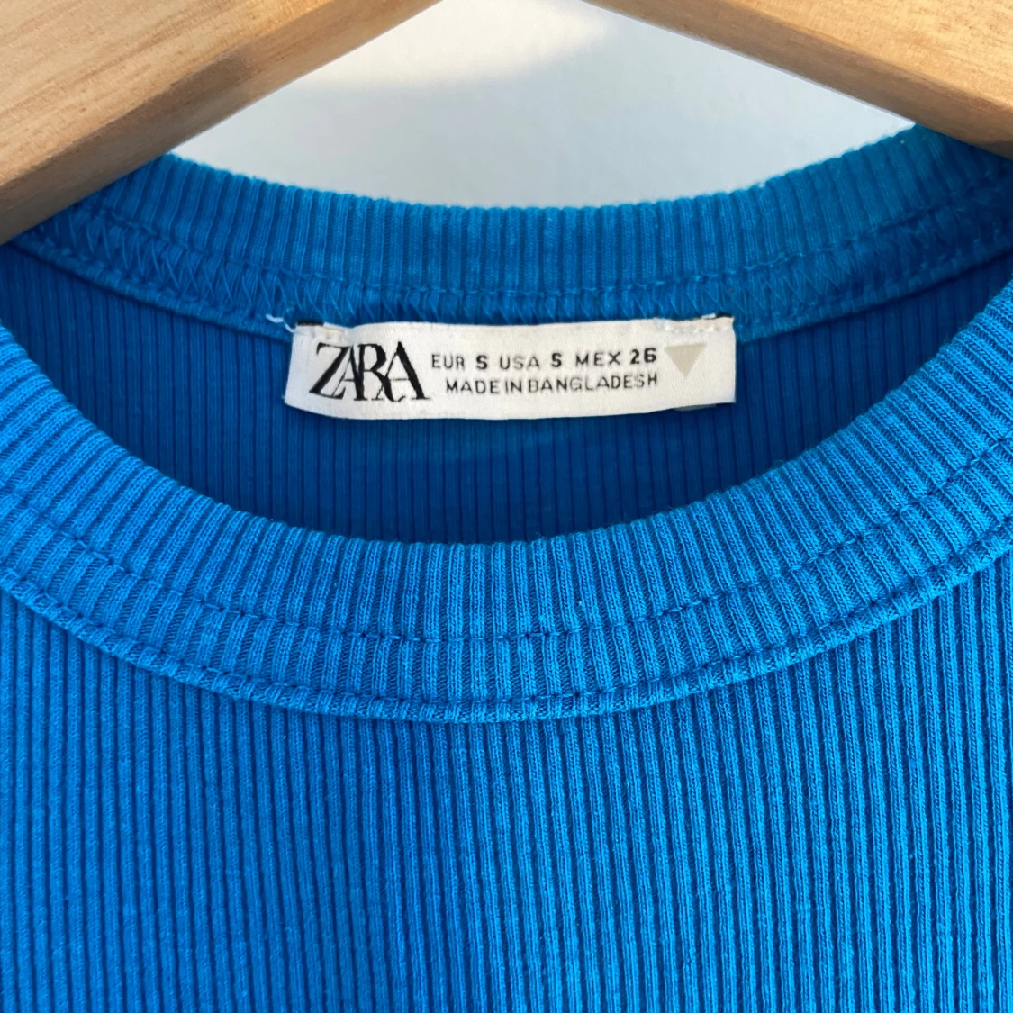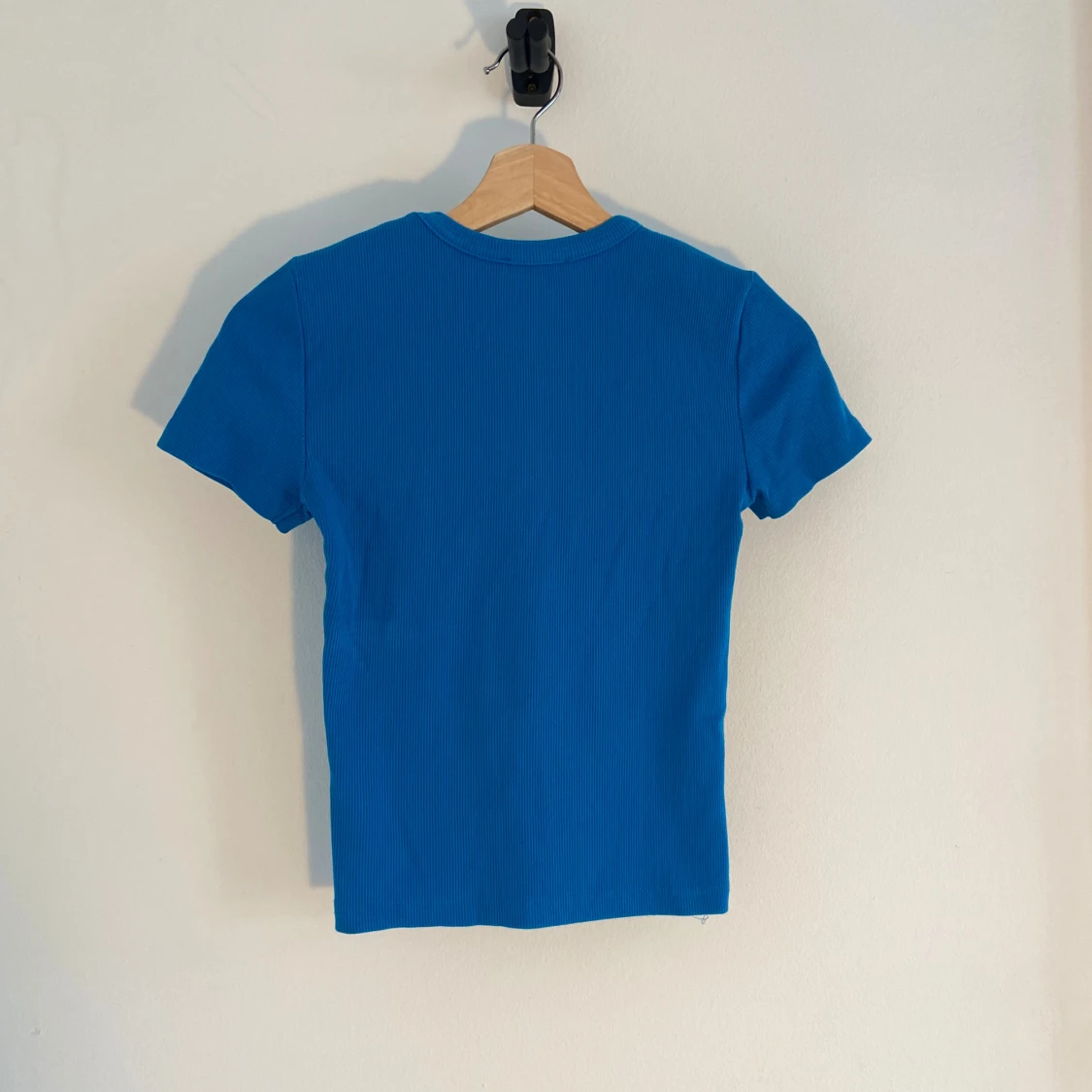 Snygg blå t-shirt från Zara i ribbad bomull. Modellen är figurnära med korta ärmar och rund halsringning. Perfekt att matcha med jeans eller kjol för en clean och fräsch look.