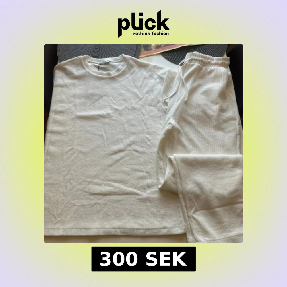 Vit ribbad t-shirt och byxor från Zara i storlek XL. T-shirten har rund halsringning och är tillverkad i ett mjukt, strukturerat material som känns skönt mot huden. Enkel och clean design som passar perfekt till ett avslappnat set. Ett myssett