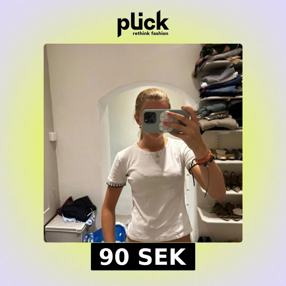 Säljer en vit t-shirt med korta ärmar och rund hals. Ärmsluten har snygga pärldetaljer i vitt och svart som ger en unik touch. T-shirten har en normal passform och är gjord i mjuk bomull, perfekt för en chill och stilren look.