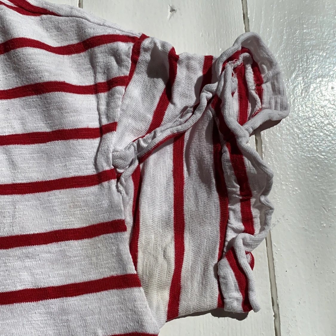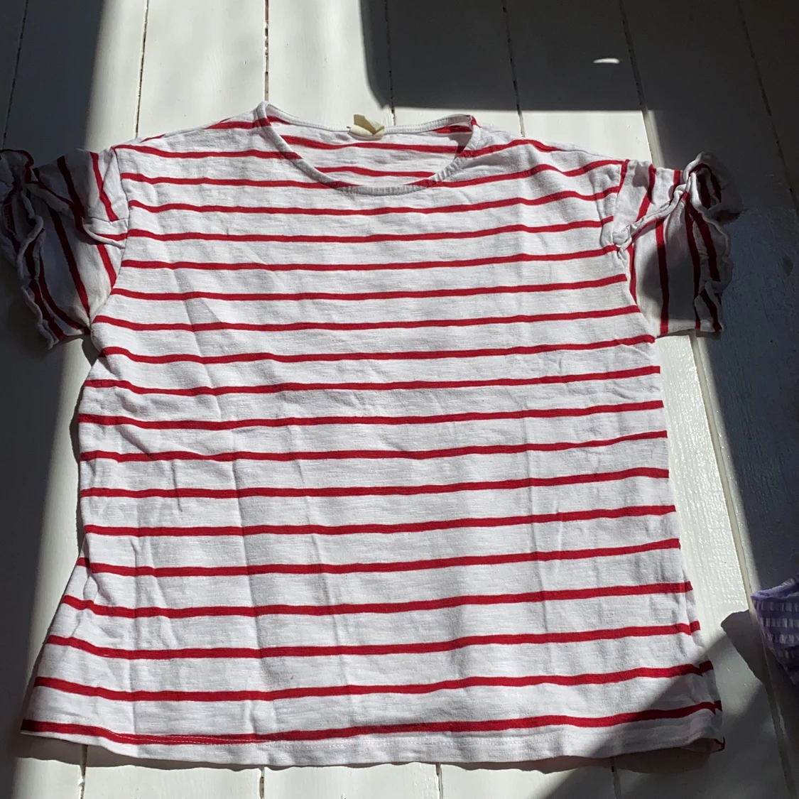 Supersöt t-shirt från Zara med röda ränder och fina detaljer på ärmarna. Sitter som XS/S. Säljer för den nt kmr till användning! ❤️ jättebra skick, knappt använd.